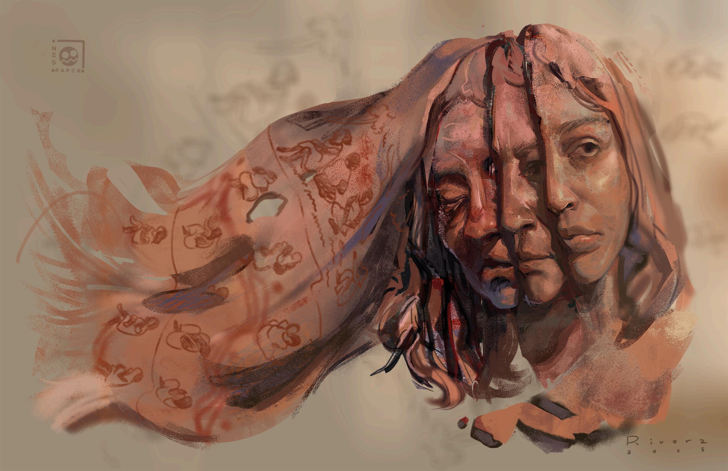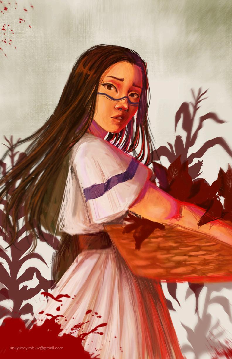 Esta obra está inspirada en la Sublevación Campesina e Indígena de 1932 en El Salvador. El retrato es una alegoría de la mujer indígena salvadoreña y su sufrimiento durante el levantamiento y la posterior masacre. La figura central emerge de un campo de maíz y hojas oscuras, elementos que simbolizan la tierra, la agricultura y la vida que sustentaba el pueblo, contrastando fuertemente con la violencia que sufrió. El rostro, marcado con líneas ceremoniales que evocan la identidad ancestral, lleva una expresión de dolor, desafío y profunda tristeza. La cesta que sostiene no sólo representa la labor campesina, sino que también está cargada con el peso de la sangre y la pérdida. El vestido blanco, manchado de rojo carmesí, y las salpicaduras de sangre en el primer plano, hacen referencia directa a la brutalidad de la matanza, la represión y el silencio forzado que siguió al evento. "La Cosecha Roja" es un homenaje a las víctimas y una memoria visual de la dignidad mancillada de un pueblo.