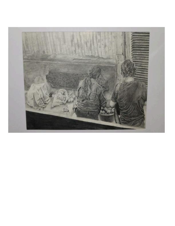 En la composición se observan dos figuras humanas de espaldas, inclinadas hacia una superficie donde reposan objetos o alimentos cubiertos por telas. El entorno sugiere un espacio urbano sencillo, con muros y estructuras que evocan el paso del tiempo.