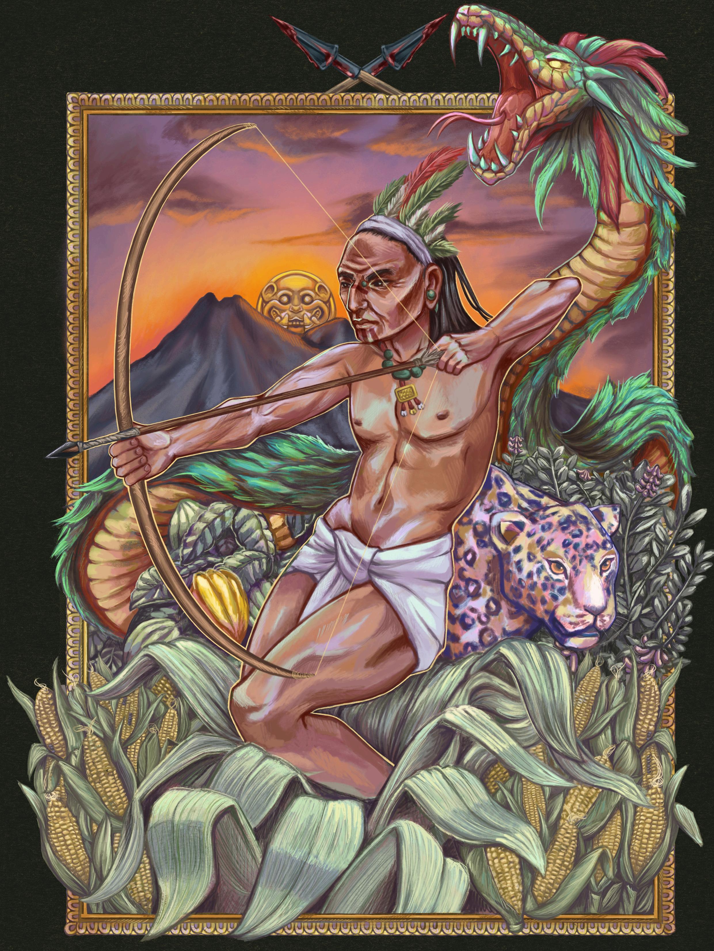 La Ilustración representa el antiguo reinado de Kuskatan, evocando su grandeza y el espíritu ancestral de sus tierras. En el centro emerge la figura de un indígena, firme, con arco y flecha en mano, símbolo de resistencia y dignidad, usando un maxtlatl, prenda prehispánica común y un collar con el sello del territorio kuskatan. Su cuerpo surge entre hojas de maíz, rodeado de mazorcas doradas que encarnan la raíz de la vida y su abundancia en Mesoamérica. A su alrededor florece el cacao y el jiquilite plantas importantes que narran la riqueza natural y el arte del añil, herencia de un pueblo creador.