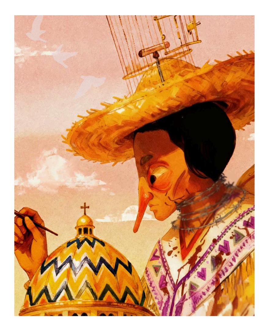 Esta ilustración explora la censura cultural como construcción de memoria histórica en San Salvador a través de tres elementos simbólicos interconectados. La cúpula de la Catedral Metropolitana, representada en su estado actual monocromático tras haber sido pintada completamente de blanco, funciona como metáfora del borrado institucional de la diversidad cultural y el olvido deliberado impuesto sobre las raíces policromáticas de la ciudad. El personaje central constituye una reinterpretación del Torogoz transformado en figura antropomorfa indígena, un acto de reapropiación simbólica donde el ave nacional se reconfigura para visibilizar identidades ancestrales sistemáticamente silenciadas en los relatos hegemónicos, evidenciando el sincretismo entre símbolos oficiales republicanos y herencias precolombinas. Sobre el sombrero tradicional del personaje se sitúa una jaula de la cual escapa un pájaro en vuelo, simbolizando tanto la posibilidad de liberación de las memorias contenidas como la aspiración de que las expresiones culturales indígenas trasciendan las estructuras de contención impuestas sobre ellas. El alambre de púas que rodea el cuello del personaje materializa la violencia ejercida sobre las expresiones culturales indígenas, representando la opresión que contiene y limita el derecho a recordar y existir culturalmente en el espacio urbano. La obra cuestiona qué memorias se preservan y cuáles se suprimen, proponiendo que recordar nuestras raíces diversas es un acto de resistencia creativa frente a los silencios arquitectónicos y culturales que caracterizan la disputa por la memoria en San Salvador.