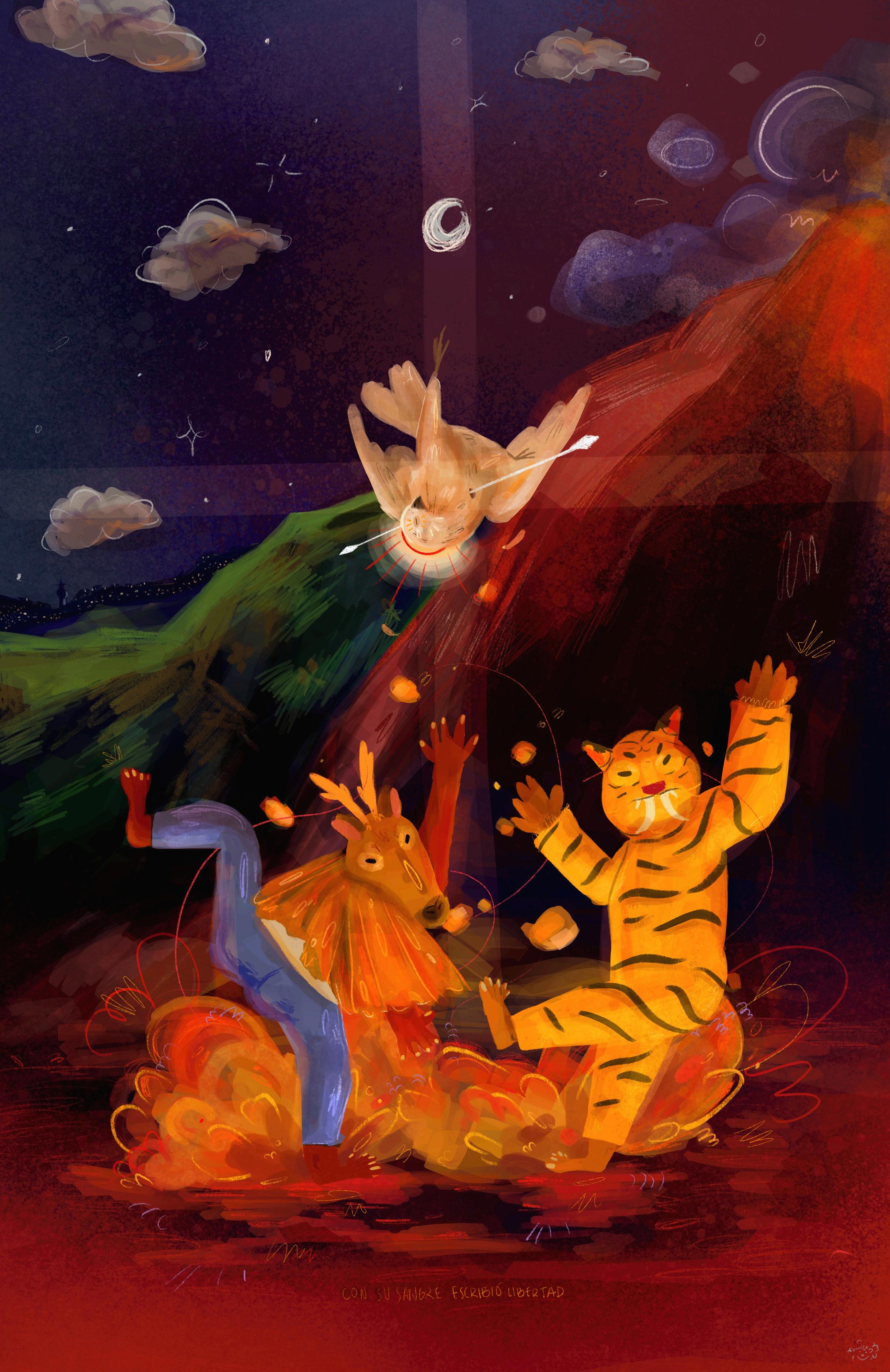 Desde el cielo visualizo a mi hermoso pulgarcito, desde el cielo contemplo los cerros, los lagos y los cultivos, a lo lejos escucho las risas y los llantos; pero siento que, más allá de todo eso, hay algo que aun está oculto, hay algo que se está olvidando. Mi corazón late con tanta fuerza; mi torogoz se refugia en mí, pero siento un calor en el pecho que me lastima y duele. Mis ojos arden, necesito romper en llanto, pero le prometí a mi pueblo mantenerme fuerte y no permitiría caer ante los que me están apuñalando.