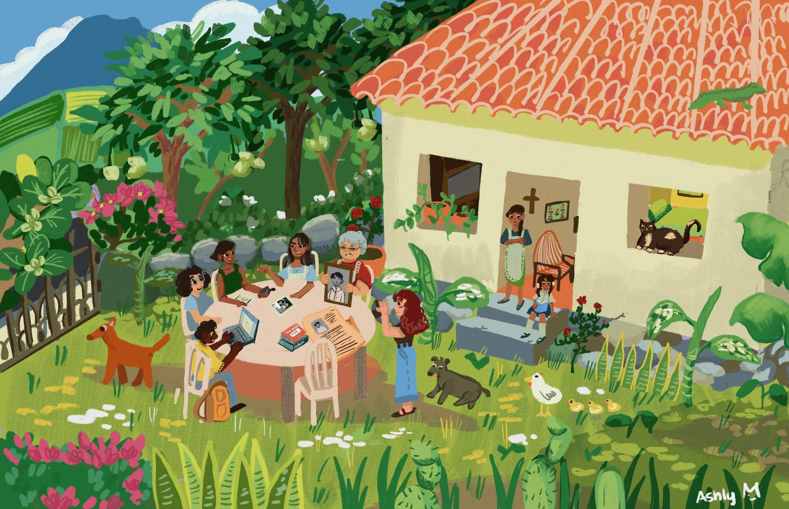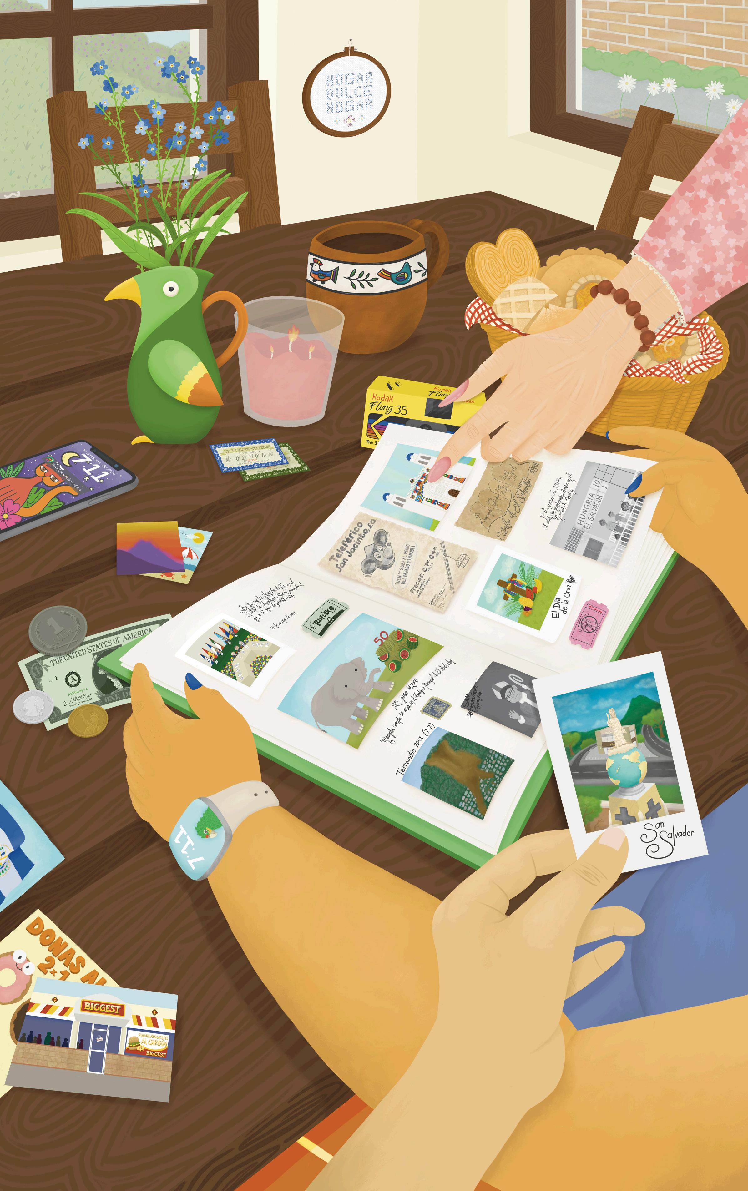 “Recuerdos de una Memoria” presenta a tres miembros de una familia hojeando un álbum de fotos lleno de historias de nuestra hermosa ciudad de San Salvador. Desde momentos históricos a lugares que ya no están y tradiciones que lentamente se desvanecen, la historia de nuestro país está llena de constante cambio y evolución, y esta ilustración busca capturar exactamente eso. La experiencia de hablar con familiares sobre el pasado y nuestro presente es algo universal con lo que todos podemos identificarnos de una forma u otra, incluso si las historias que compartimos son diferentes. Los eventos a los que mi ilustración hace referencia son cosas sobre las que yo misma he tenido la oportunidad de conversar aunque yo no los haya vivido todos personalmente y al igual que en la ilustración, espero que esta obra pueda iniciar una conversación con el público para que estos fragmentos de memoria sobrevivan al olvido.