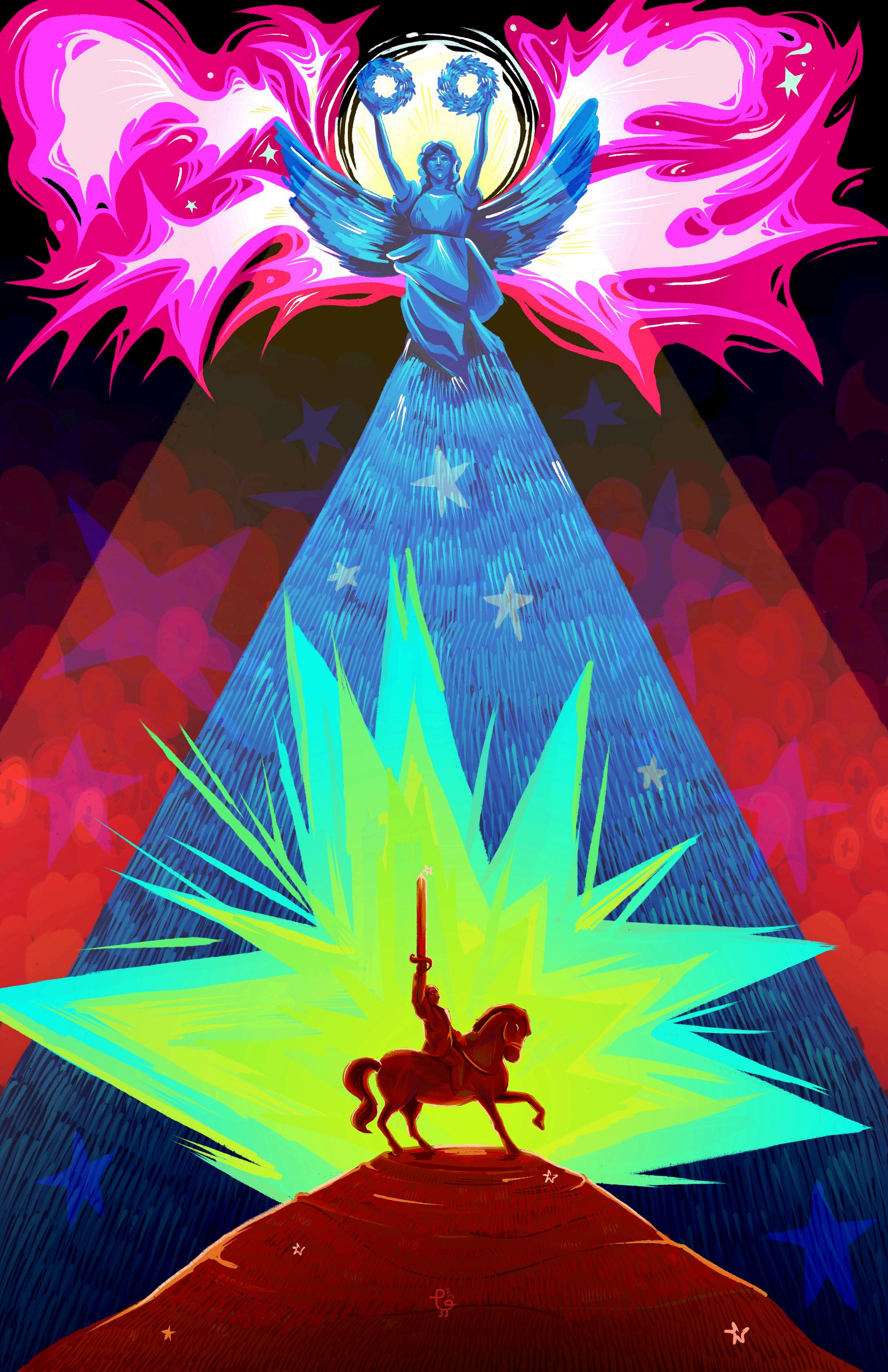 La libertad no es un privilegio, es un derecho, en 1821 logramos la independencia, pero hoy, aunque la situación no sea extrema, el riesgo de retroceso es real. Vivimos en un entorno conservador donde buscar y luchar por una nueva forma de independencia es necesario para prosperar. Dentro de la ilustración podemos ver elementos como: el monumento a los próceres, el cual, no solo es un homenaje, sino en un faro que proyecta luz hacia el presente. Un caballero, representando una figura colectiva, el pueblo, listo para movilizar y luchar por él. Los rayos y estrellas, no como ornamentos, sino, símbolos de esperanza que buscan guiar el camino y en el fondo rostros simplificados que observan el futuro por el cual muchos lucharon. Como resumen, dejemos de esperar y empecemos a actuar. La independencia no se celebra una vez al año, se construye todos los días.