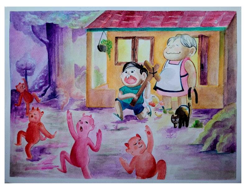 En esta obra quise retratar las historias tradicionales contadas por los abuelos, particularmente aquellas relacionadas con el Día de la Cruz. Según estas creencias populares, si no se colocaba una cruz ese día, los diablos comenzaban a bailar frente a las casas.
