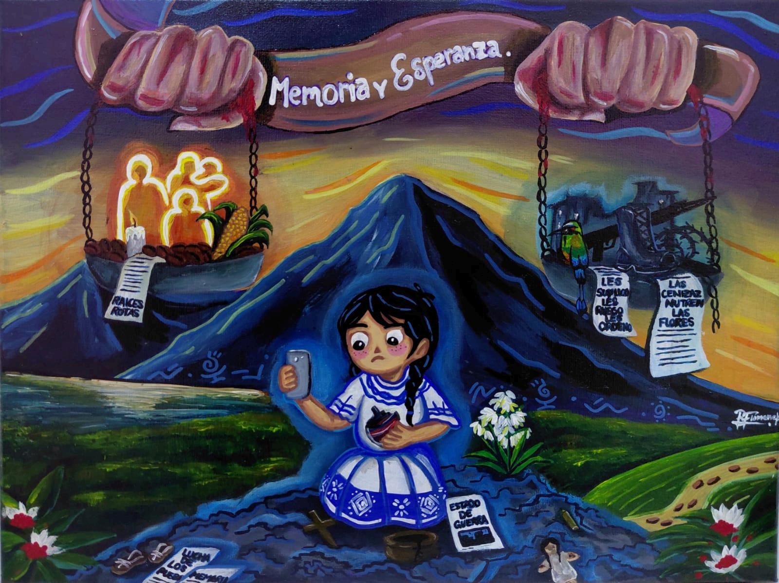 La niña vestida de añil, figura de la nueva generación, utiliza un móvil para confrontar la historia, simbolizando el eje transgeneracional digital. Se asienta sobre escombros y testimonios silentes (pertenencias y archivos), la Flor de Izote brotando de la tierra herida, como emblema de la resiliencia del alma salvadoreña.