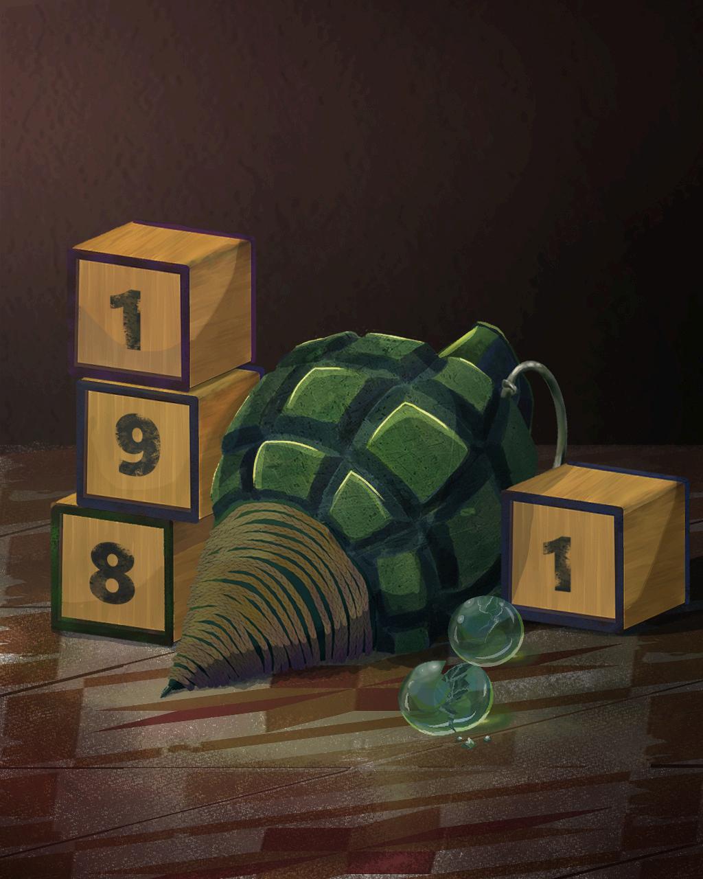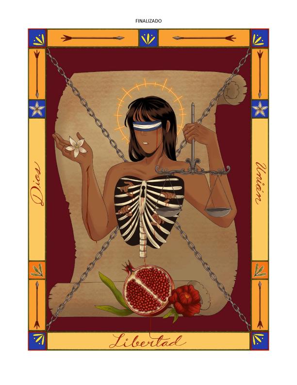 La figura central con la pose de "La Justicia", vendada por la patria, símbolo de una ceguera impuesta ante las heridas nacionales históricas. La granada, manchada de sangre, alude a la vida arrebatada a quienes nunca alcanzaron la libertad prometida. En el marco, que mezcla azulejos (traídos durante la conquista) con la flor de izote y el loroco, representando la permanencia del pueblo, uno que se aferra a su tierra y tradiciones.