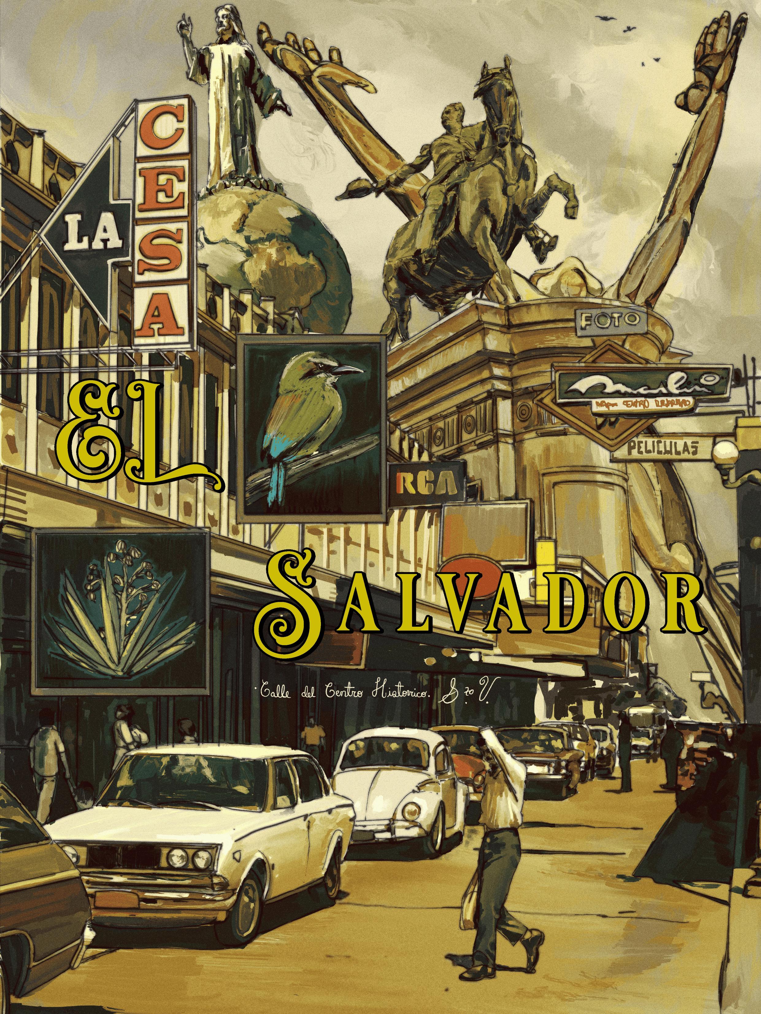 Inspirado en la estética visual de los años setenta, realicé una ilustración que busca evocar ritmo y profundidad a través de la composición, utilizando como punto focal los monumentos más representativos de San Salvador, la capital. La obra incorpora además pequeños recuadros que aluden a símbolos de identidad nacional.