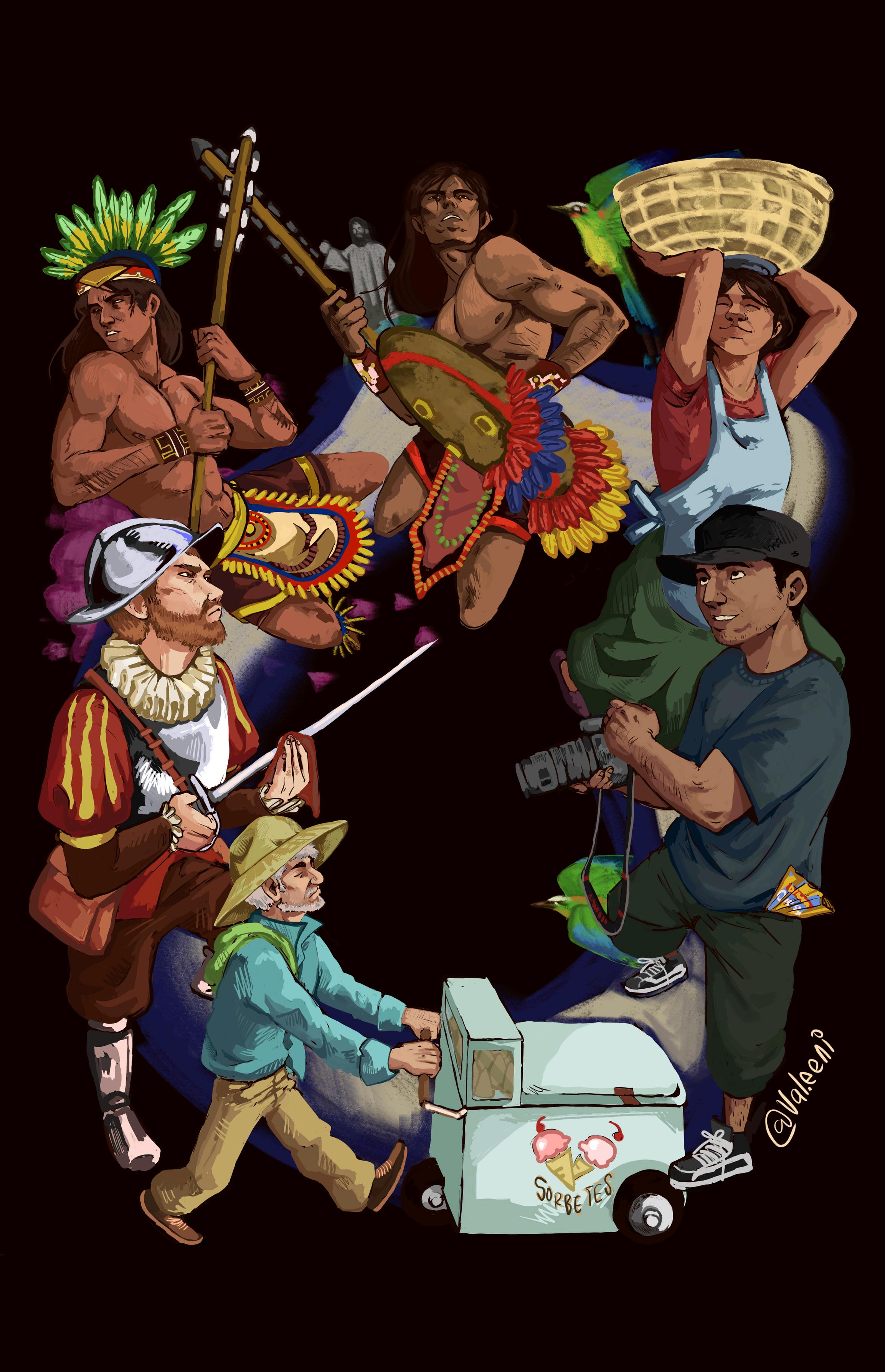 La obra muestra un recorrido que inicia con un español y culmina con un vendedor de sorbetes, que nos transporta a una linea del tiempo, visitando nuestras raíces, recordando eventos históricos que terminaron por definir lo que somos hoy en día.