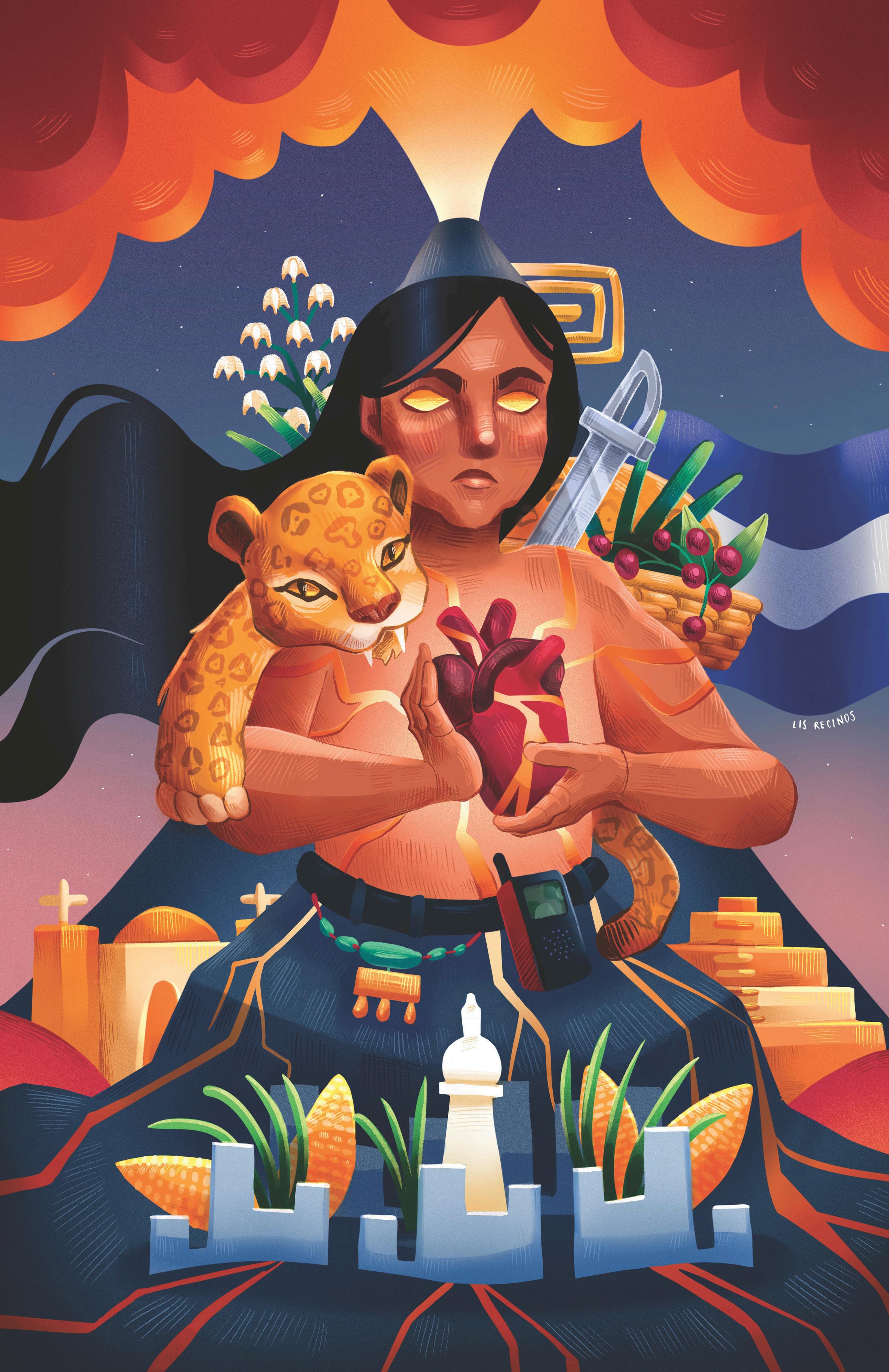 Ella está rodeada de unas vasijas, del paisaje y el ave nacional que evocan nuestras raíces y la conexión con los pueblos indígenas, guardianes de una memoria que resiste el olvido. Cada símbolo se entrelaza para recordarnos que la identidad salvadoreña surge de un vínculo profundo con la historia y su gente.