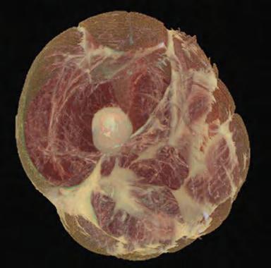 Figure 1.18 A modern rendition of the fascial net (from Jeff Linn using the Visible Human Data Project). Here we can see the thigh. This is a small section of what could be mapped in full, i.e., the fascial webbing of the body, which would include everything from the meninges to the organ bags and supports, the muscles’ epimysia, endomysia, and intermuscular septa, surrounded by the deep investing fascia and the superficial areolar and dermal layers.