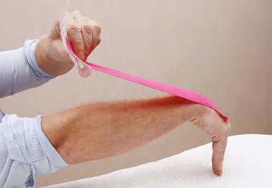 Figure 1.13 A stretch of 50% is applied to the center of the kinesiology tape by using the thumbs.