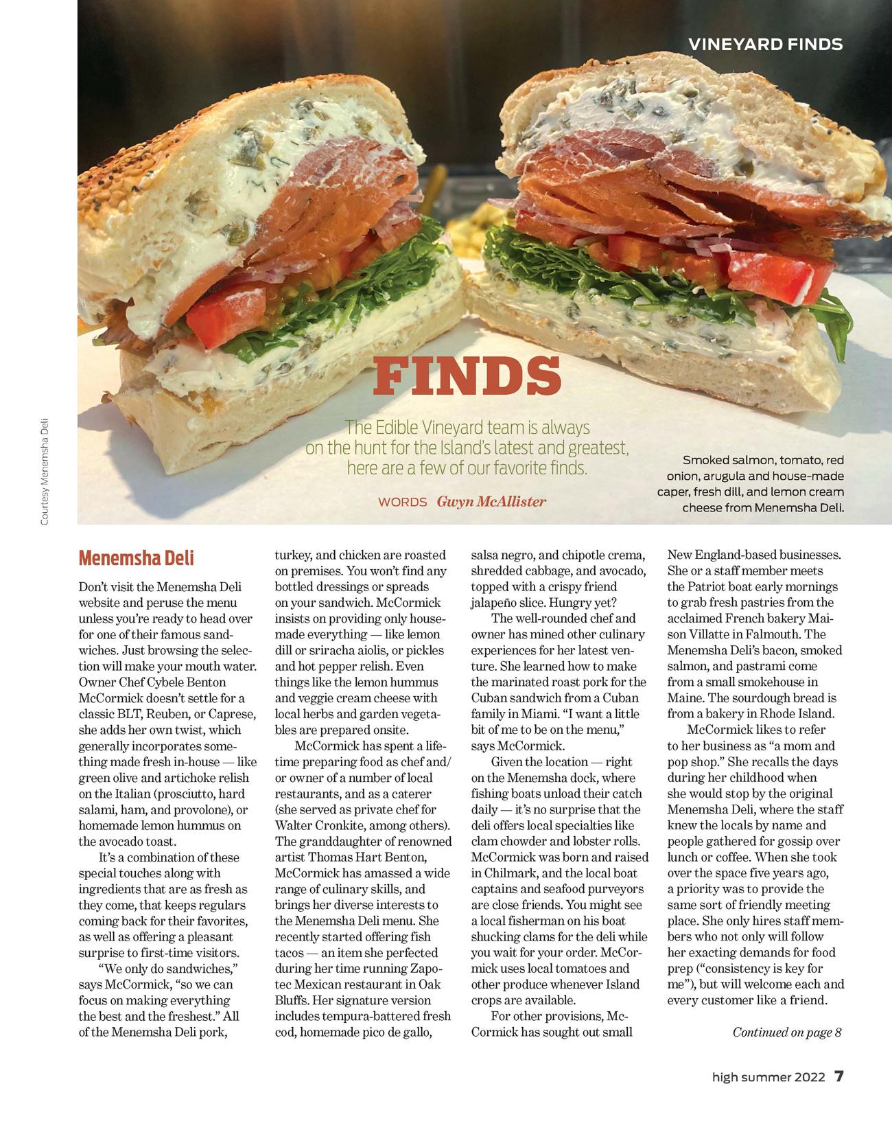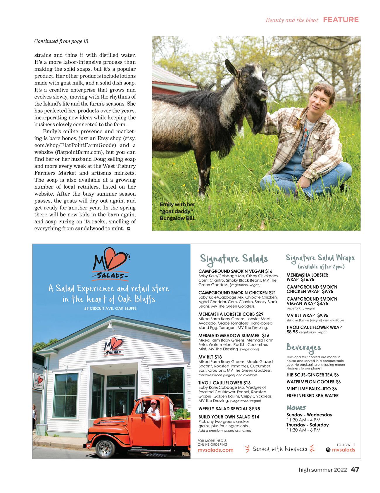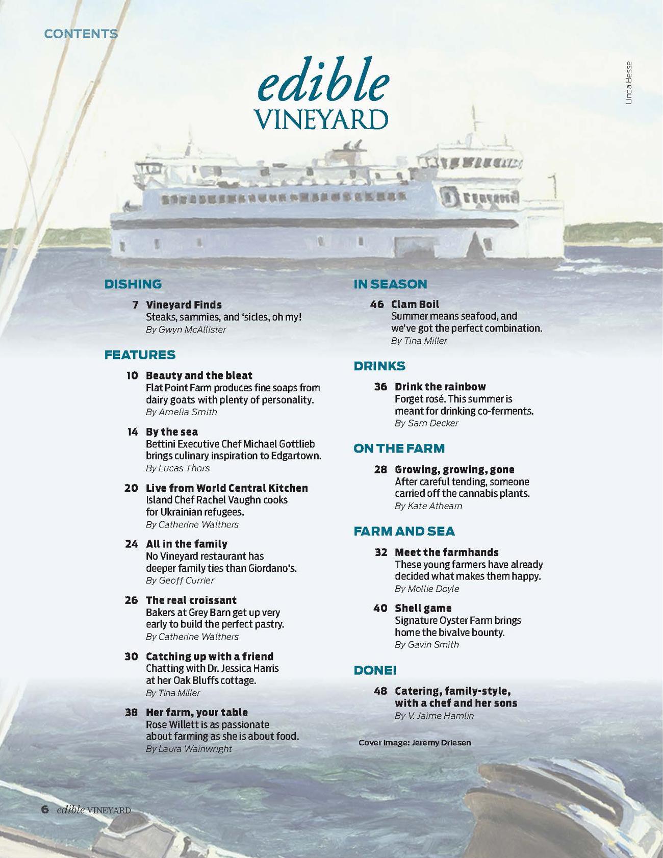 This issue stole our (bleating) hearts, especially Amelia Smith’s story about the goat’s milk beauty products made by Emily Fischer at Flat Point Farm. Catherine Walthers’ story on World Central Kitchen and cooking for Ukrainian refugees gives us a bird’s-eye view of how an Island chef is doing her part to make the world a better place. Geoff Currier strolls down memory lane with the Giordano brothers, who still make pizza the way their grandparents did. And if you’re wondering what dreams lie in the minds of Island farmhands, look no further than Mollie Doyle’s introduction to young adults who come from all over to get their hands dirty. And it wouldn’t be a Vineyard summer without an old-fashioned clam boil. You’ll find that this simple In-Season summer recipe is sure to be a crowd pleaser. Let’s all fill our plates with the freshest local ingredients we can find and tip a glass to summer!
