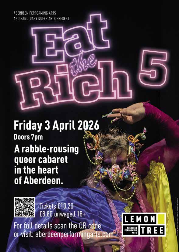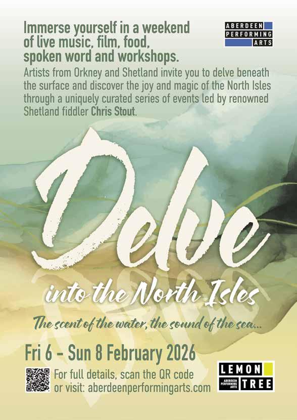 Welcome to the Lemon Tree Spring brochure 2026! We have a packed season of music, comedy, theatre, festivals and family shows to get the year off to a flying start. Festivals lead the way with renowned folk musician, Chris Stout, curating Delve with a series of gigs, workshops, spoken word and film screenings with musicians from Orkney and Shetland. We then celebrate the tenth year of the Granite Noir crime writing festival to give all the budding sleuths a chance to investigate and enjoy. Comedy fans are in for a treat with Tom Stade and MC Hammersmith bringing the laughs and our theatre programme is taking quality shows to Aberdeen such as Saint Joan and The Singer. Get involved and find your new favourite show at the Lemon Tree! Book your tickets at the box office today.