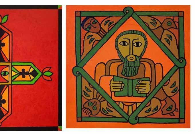 Luo Qi’s canvas ‘Note 9’ is a play on green and red. In a bottom right square a monk in red is painted on a green background. An accumulation of symbols ties that painting with its partner canvas ‘Note 8’, presenting an unwavering ‘modern’ painting (across two canvases) which reminds the viewer of medieval imagery. Another series, Note 10,11,12 (2023), projecting Kandinsky yellow, shows a human figure with a head appendage reminiscent of Medieval pictures of bishops. Other canvases which bring to mind ‘The Lindisfarne Gospels’ (c. 700, found at Lindisfarne Priory on Lindisfarne, Holy Island).