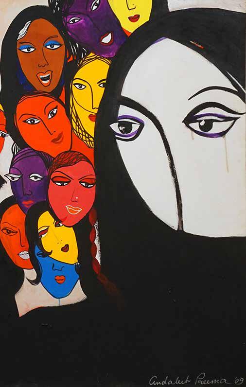 within the Asian diaspora, as ‘women of the world’. The painting ‘Cosmopolitan Women’ (p256, 2014) is, poignantly, a mixed media piece used as the front cover of the artist’s book ‘Preema Donna’, and it’s slip cover. We see oblique references to the fashion magazine ‘Cosmopolitan’, its Western style and glamour, with photographic cut-out images. These become contrasted with images of women with hijab (hair covering), and some niqab (a veil that covers the face, but leave the eye area uncovered) while others wear the burqa (a female full body covering), none of which are technically compulsory in Bangladesh.