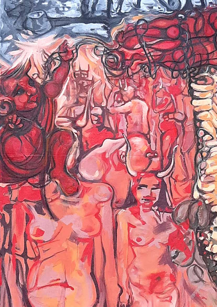 In her work ‘Quarantine Diaries,Volition’, Mauritian artist Avilla Damar depicts naked women with horns. Some of these women are painted in sunset pink colour while pale blue and earthy colours are used to depict other women. Their breasts, navels and rolls of fat on their stomachs are highlighted in deep tones that repel any voyeuristic pleasure in the viewer. The desexualised bodies of the naked women