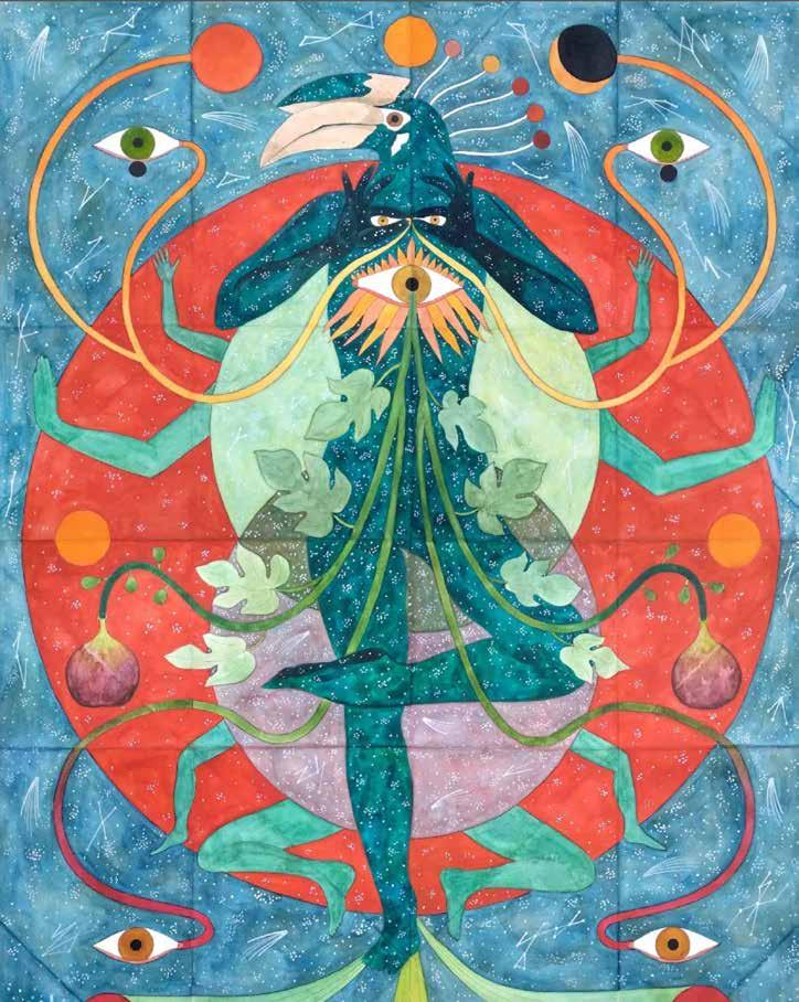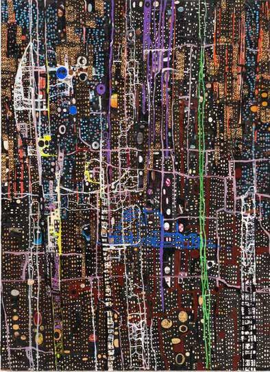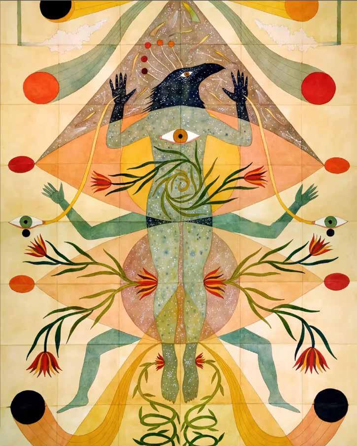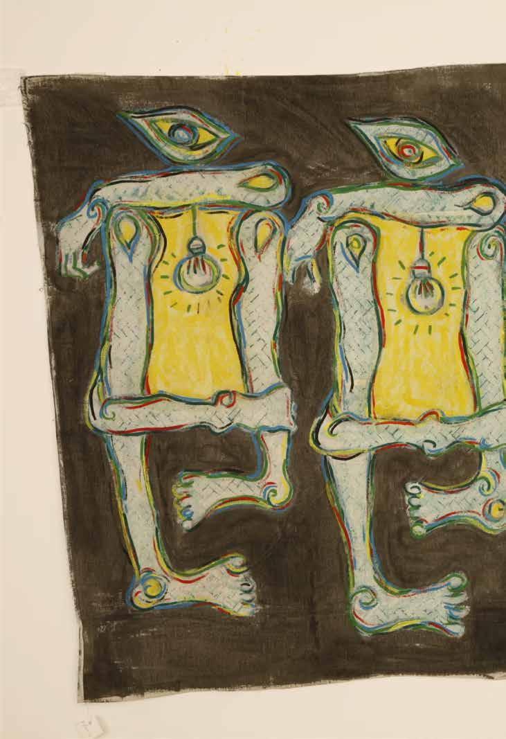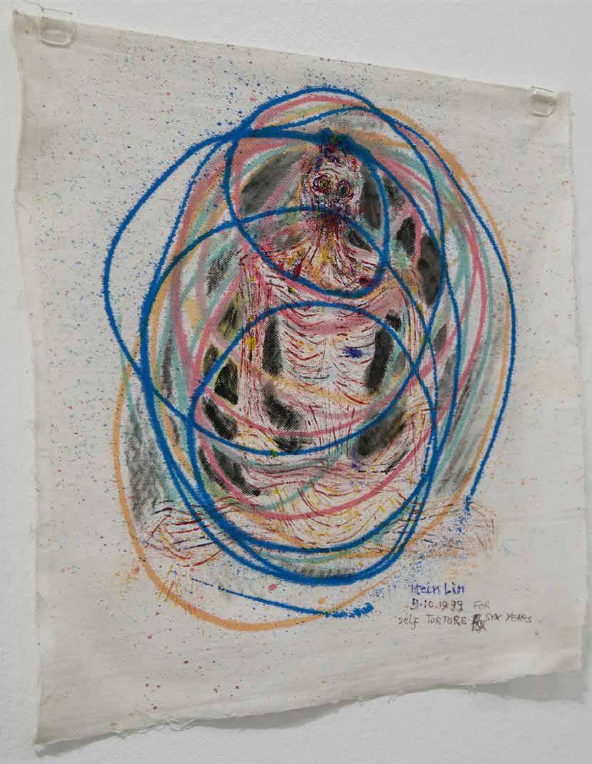 At the centre of the exhibition are over 45 works from the 000235 series (1998-2004). Titled after Htein Lin’s International Committee of the Red Cross (ICRC) number, they demonstrate the ingenuity and originality of his art made in confinement: printed and drawn labyrinths of swirling arteries, suffering organs and razor-sharp bones marked with the tops of toothpaste tubes, medical bottles and pill packets (Biology of Art, 1999); vibrant self-portraits painted with syringes, bowls and the artist’s fingers in the absence of brushes (Self-portrait, 2000; Peacock Self-portrait, 2002), and poignant representations of prison cells isolated by interlocking limbs (Sitting at Iron Gate, 2002). The time-stamped paintings record the rhythm and emotions of prison life: excitement for the new millennium (Happy New Year II, 2000); longing for pleasure (Dancers, 2000); and darkness mitigated by hope, fostered through Buddhism and daily Vipassana meditation (Parinivana, 2000).
