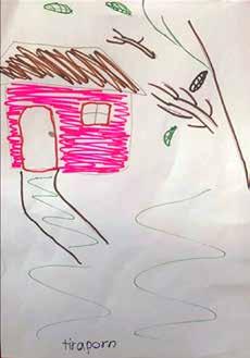 I can’t say this was a successful workshop for collecting information. The children were laughing and drawing, so it was enjoyable for them. However I wanted to ask more uncomfortable questions as prompts for their drawings. I am aware of how there is a prominent cultural norm throughout Asia where people don’t talk openly about uncomfortable subjects or directly address solving problems. Therefore, I waited too long into the session to give a tougher question to the children. They were obviously restless. The question I was able to pose was “what do you fear the most?” The drawings were made quickly, I think because they were anxious to run off as a group. Every child drew a natural disaster, such as the strength of the wind or the river rising and flooding their home or their home floating down the river. The children told me through an interpreter what the drawings were about. However, I don’t know if because they were in a rush a few people thought of the natural disaster and the rest followed which is a possibility with children. All and all I thought the response to this one question was very interesting and led to me ask questions that led to being told of past recent floods and damaging wind storms. I had not realized how vulnerable the village was seated along a river while homes are built with very impermanent methods.
