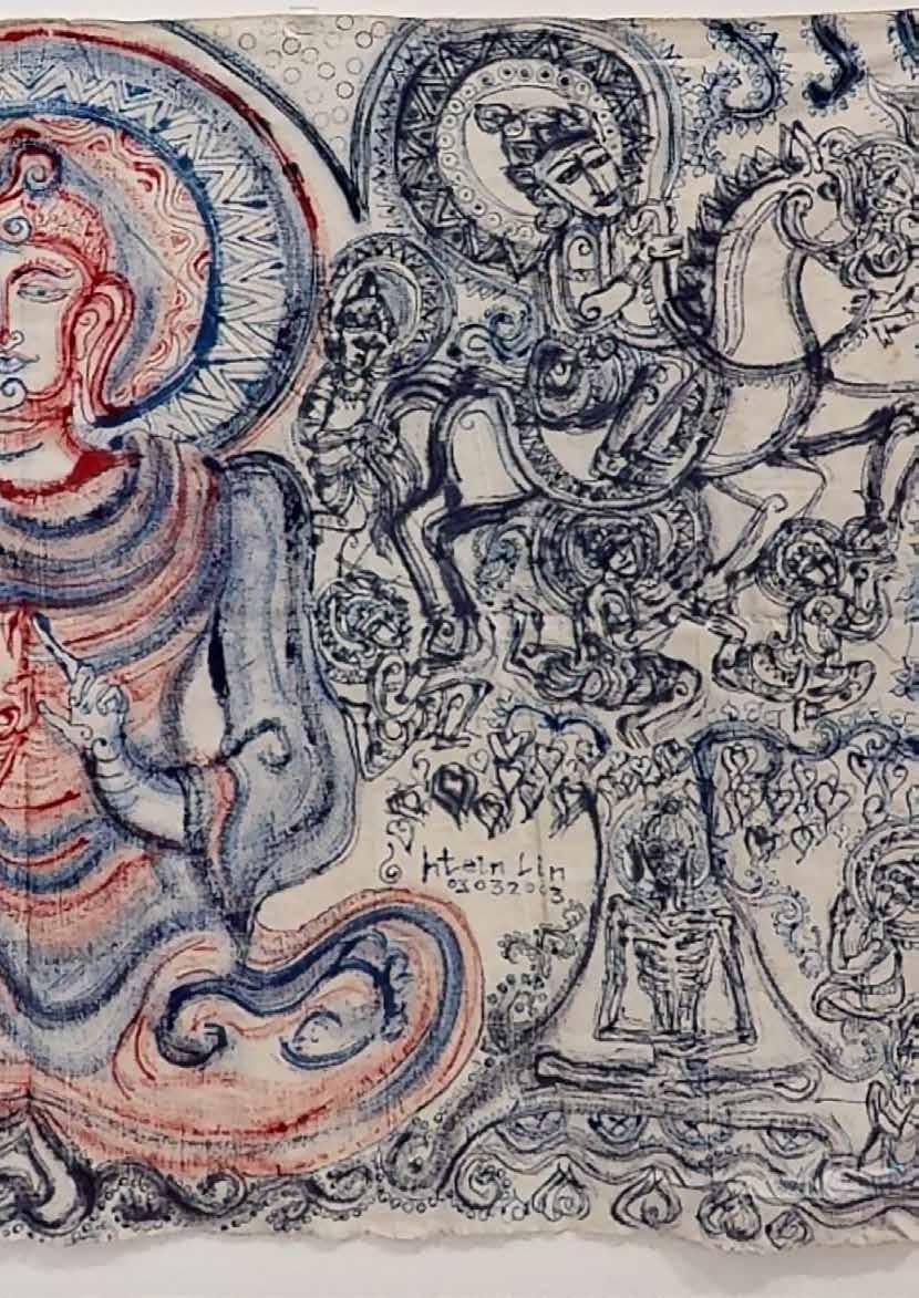 Returning to Yangon in 1992 after four years in exile and escaping detention by student rebel faction, he worked as a comic actor and artist, pioneering performance art in solo and collaborative works. In 1998 Htein Lin was accused of opposition activity and imprisoned. During his seven years in prison, he developed his visual art, using items available to him such as bowls, blocks of soap and cigarette lighters to make paintings and monoprints on cotton prison uniforms and found textile.