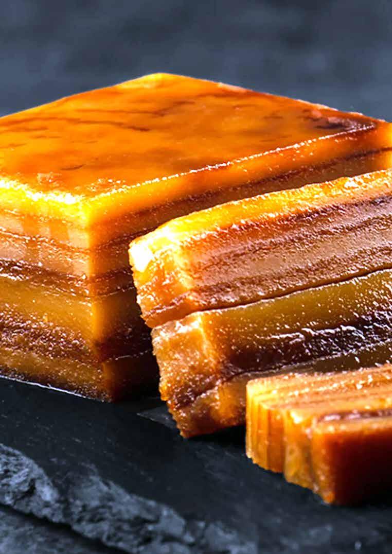 Essentially, the cake known as Bebinca begins its culinary journey with a batter of all-purpose flour, eggs, coconut milk (squeezed from grated coconut flesh), nutmeg powder and sugar mixed together in a batter. A small amount of batter is poured onto a deep pan greased with gee (clarified butter). Once this layer is slowbaked, then comes another layer with gee and caramelised sugar. This process goes on for many layers, maybe 7, 8 or up to 20 layers resembling a tower of pancakes. Once the ‘cake’ is fully baked, the very sweet Bebinca is best served on its own, or with authentic vanilla ice cream.