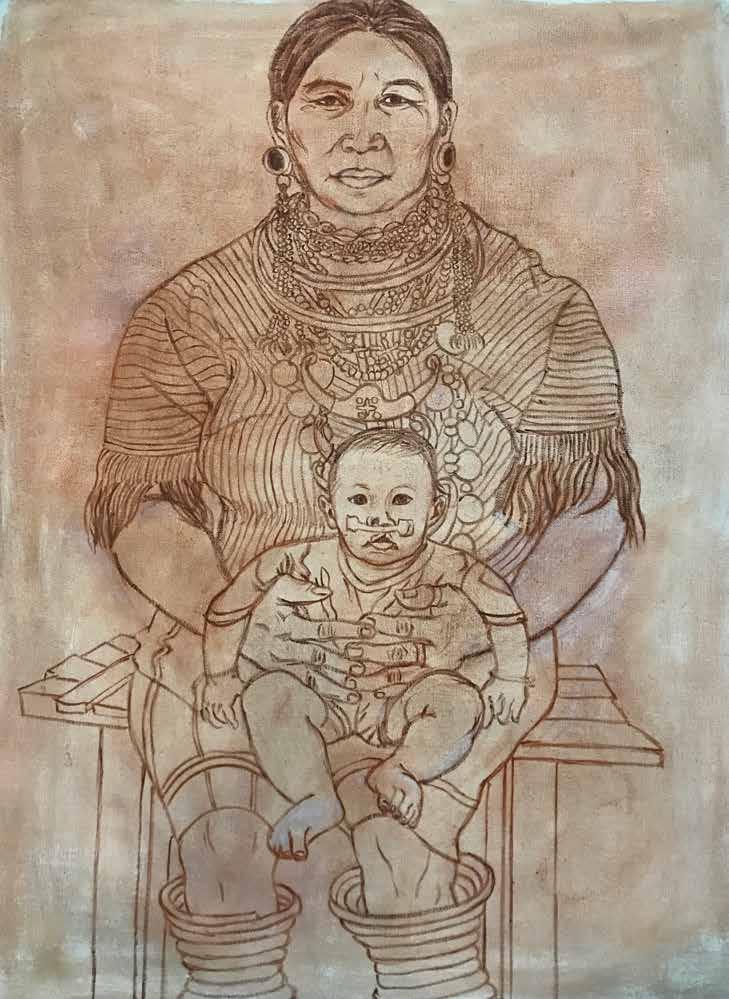 Good Friends, Kayan Women Mae Hong Son Province, Thailand. Artist: Joan Marie Kelly, oil paint on linen canvas 102cm x 84cm 2022.This is my favourite painting. Under the spontaneous circumstances, the heat, noise and pressure with the people crowded around I have to accept that some of the paintings do not have the flow of others.
