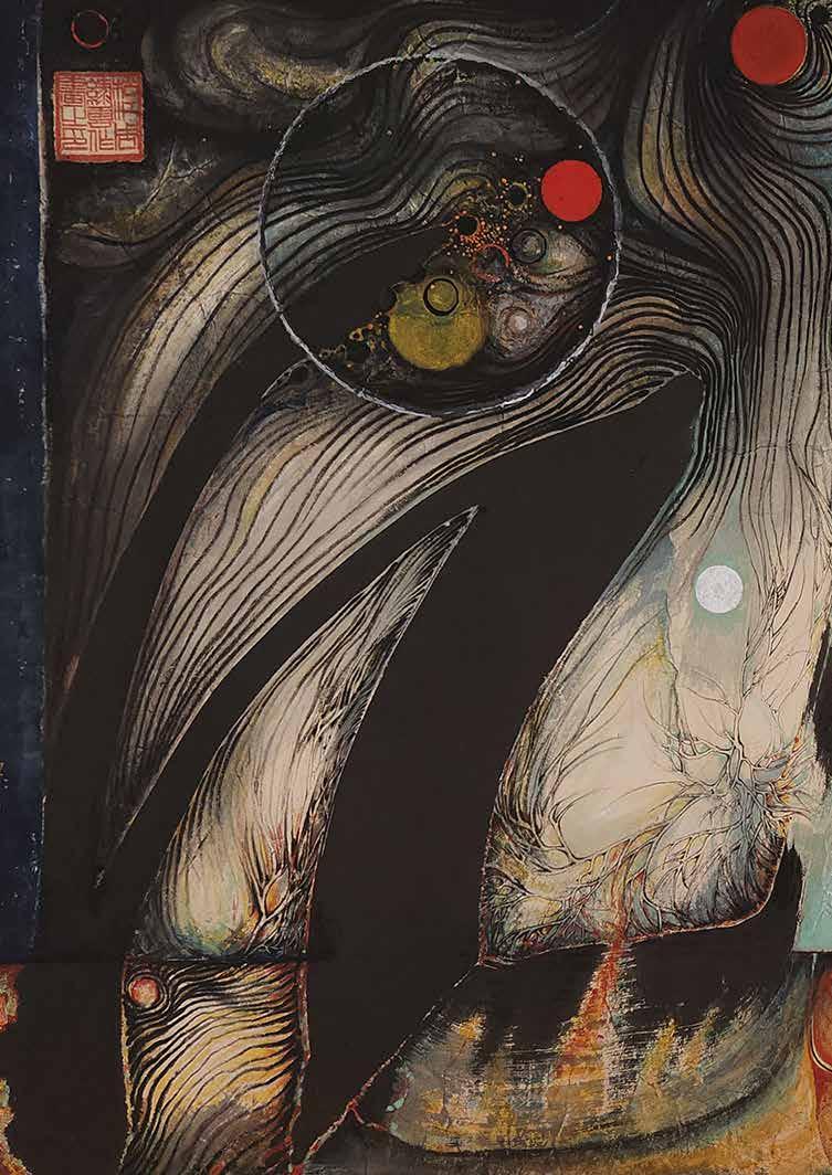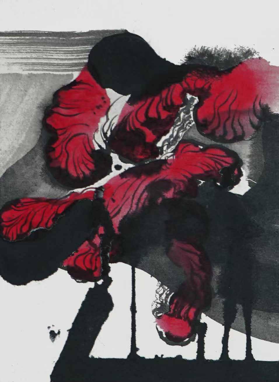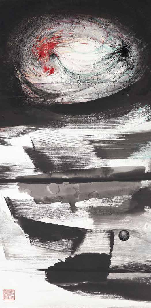 After the death of her mentor Lui Shou-Kwan in 1975 and her husband in 1978, the style of Chou's work changed fundamentally. But this depression gave her enormous energy and so her style became bolder and more spontaneous. Her works from this period were informed by her exposure to abstract expressionism, NeoConfucianism, Buddhism and Taoism. Her works of the 1980s were representative of the New Ink style emerging in Hong Kong. Her works in the 1980s demonstrate her mastery of a range of techniques associated with both the 'impact structural strokes' –the artist's distinctive violent and short brushstrokes associated with her Impact series style and the dense ink associated with her 'Dark Painting' style developed in the late 1970s. The artist carefully applied multiple layers of ink wash to both sides of the thin xuan paper (rice paper), systematically creating a sense of structure and depth, while forming a dark, thick and concentrated ink layer with a luminous surface and soft tones. In the 1980s she won several awards and became a key figure in the contemporary Hong Kong art scene.