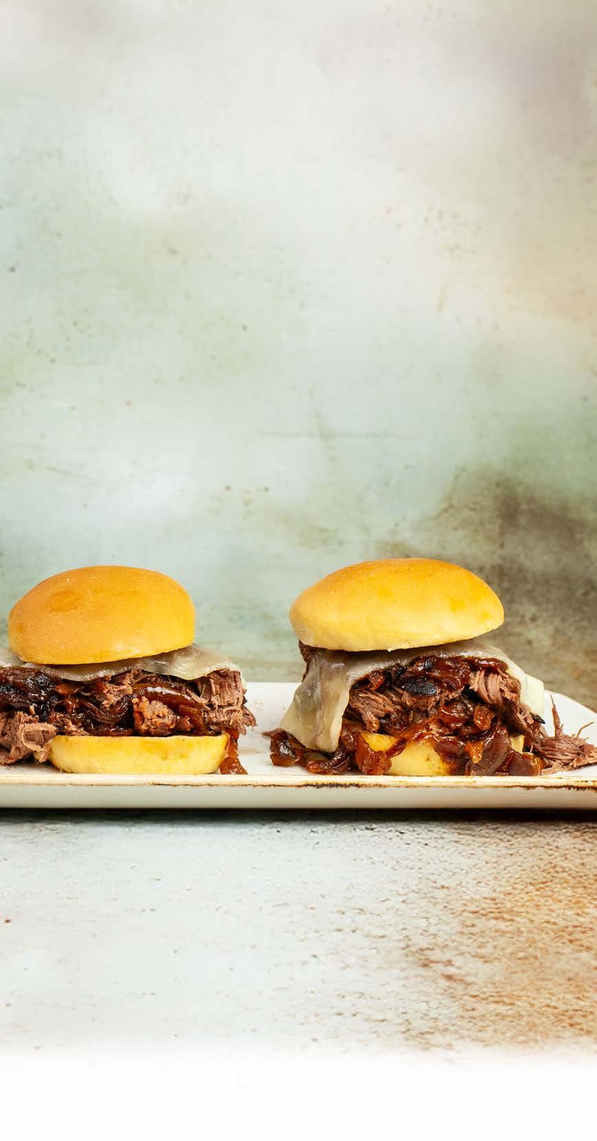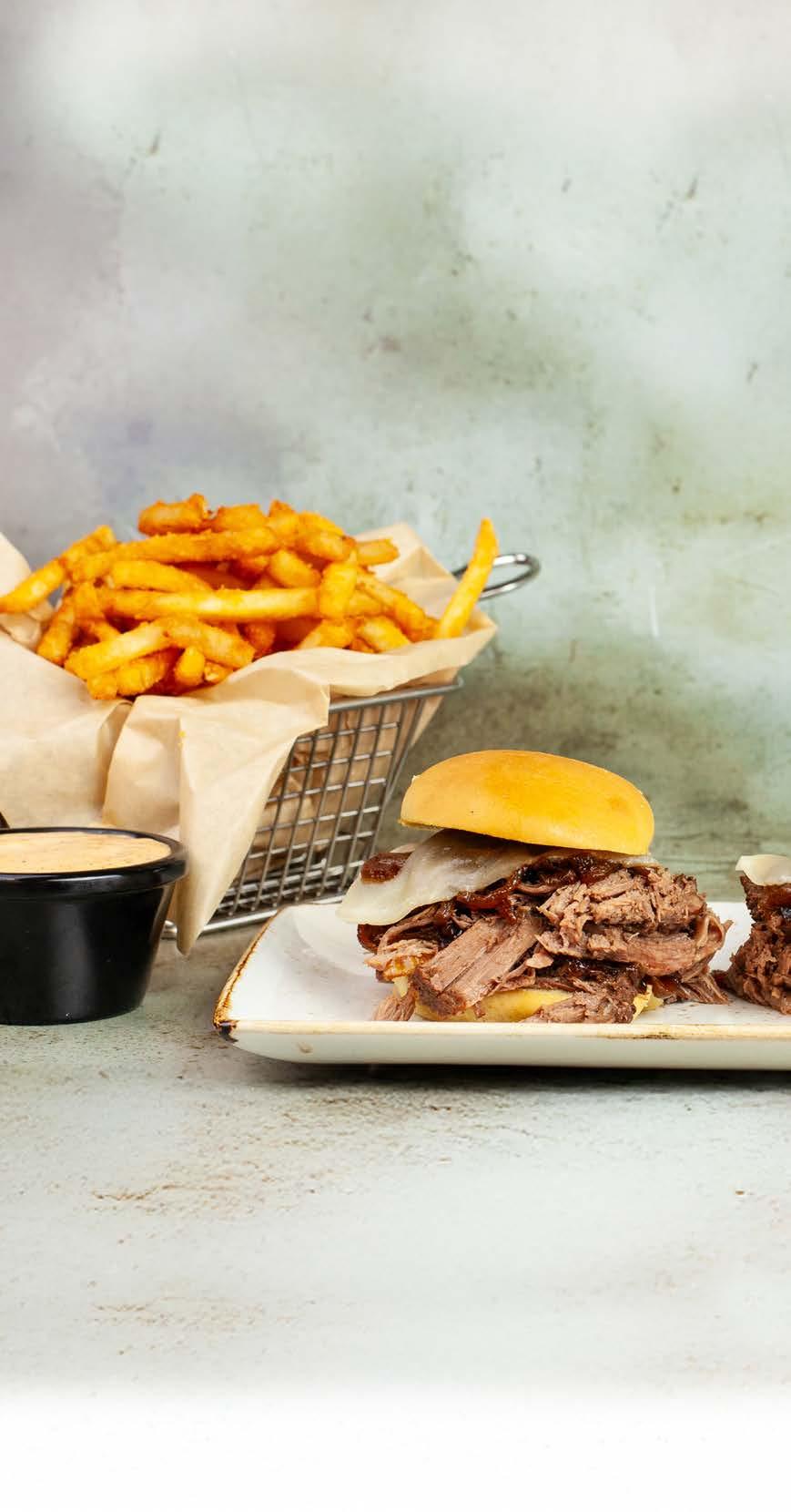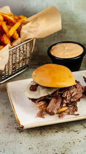 PREP | Caramelize onion. Dip shredded roast into prepared au jus; place onto buns; top with caramelized onions and provolone. Serve with fries and house sauce.
