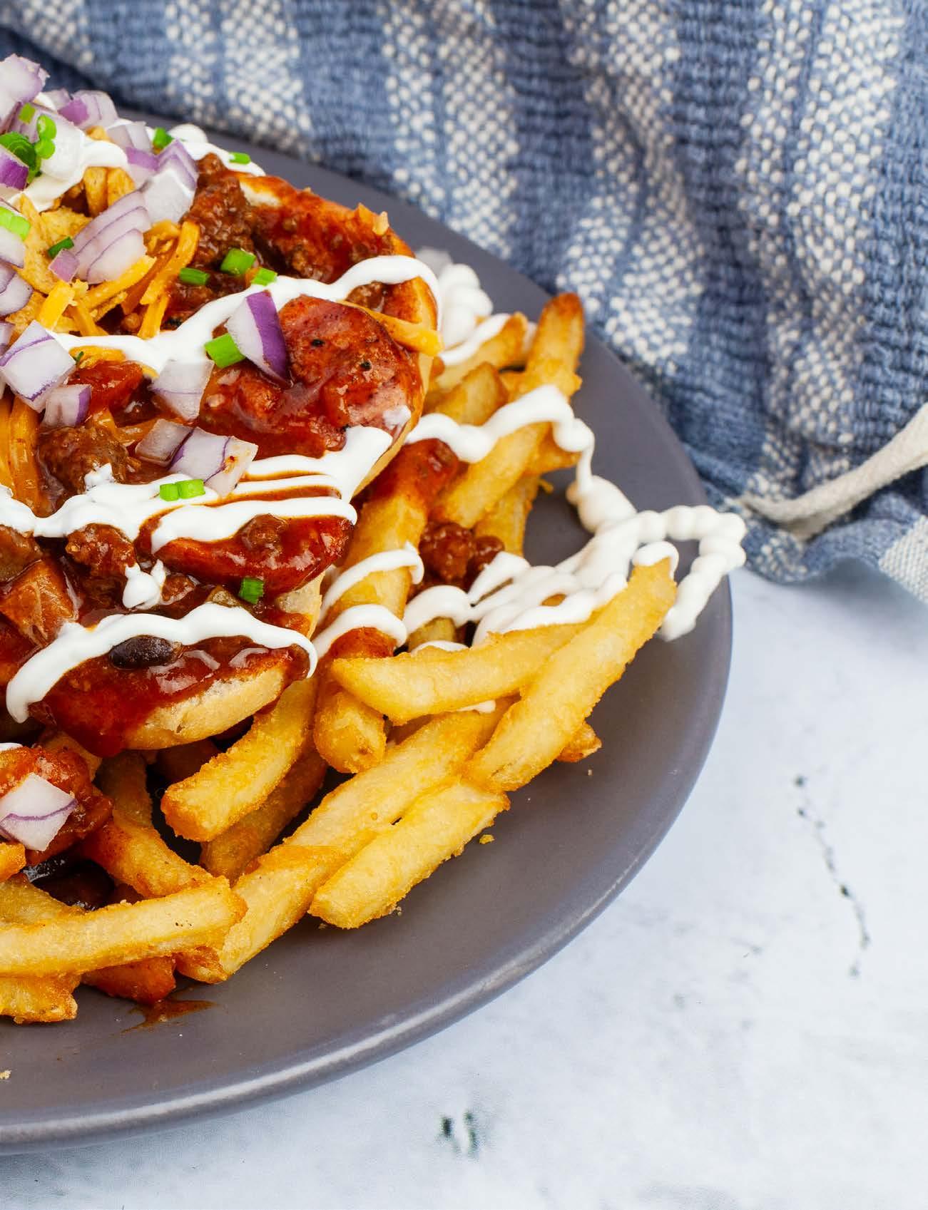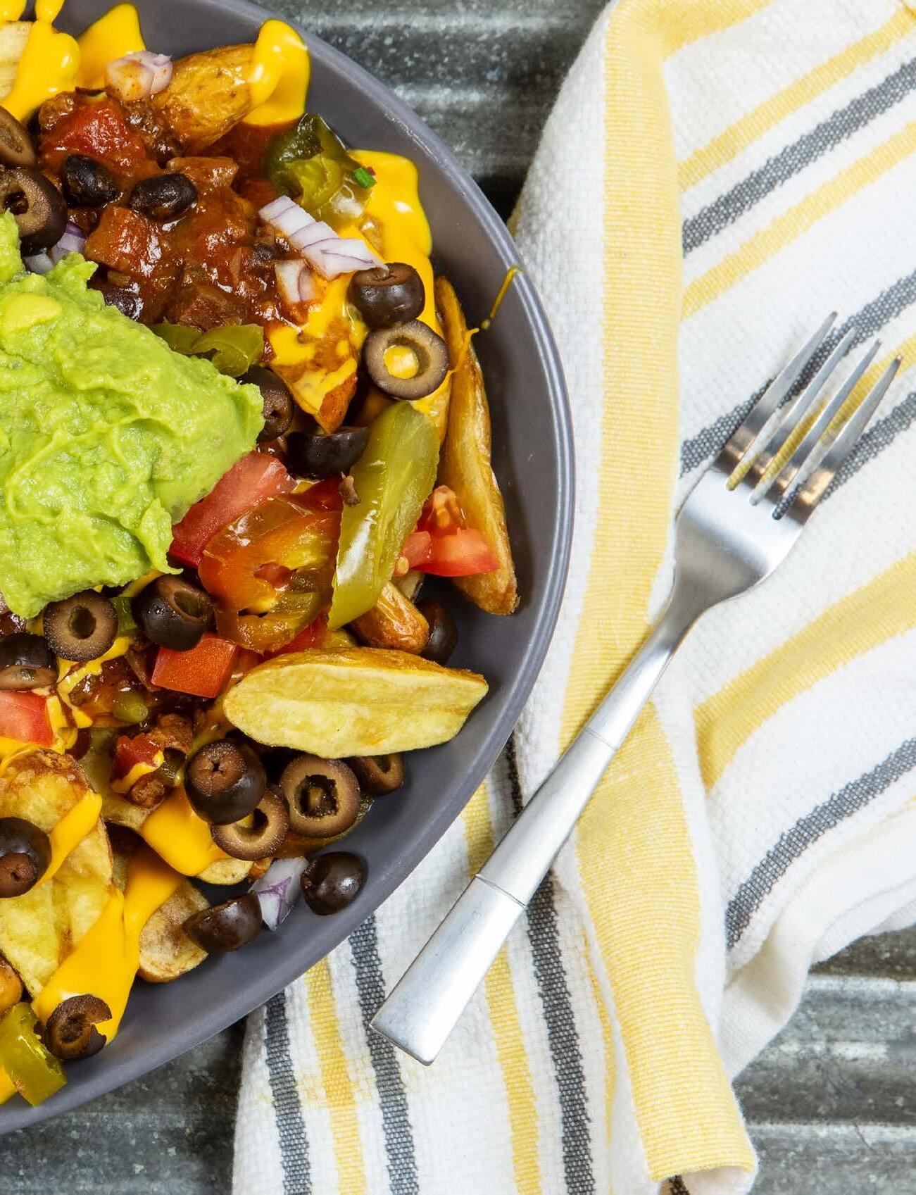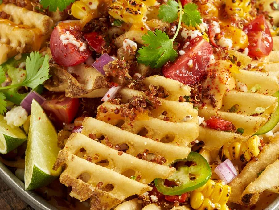 PREP | Prepare the Stealth Fries® CrissCut® Skin-On to manufacturer’s directions. Plate fries and add sliced jalapeños, sliced grape tomatoes and roasted corn. Sprinkle cotija cheese. Add sprigs of cilantro. Add a pinch of chili powder.