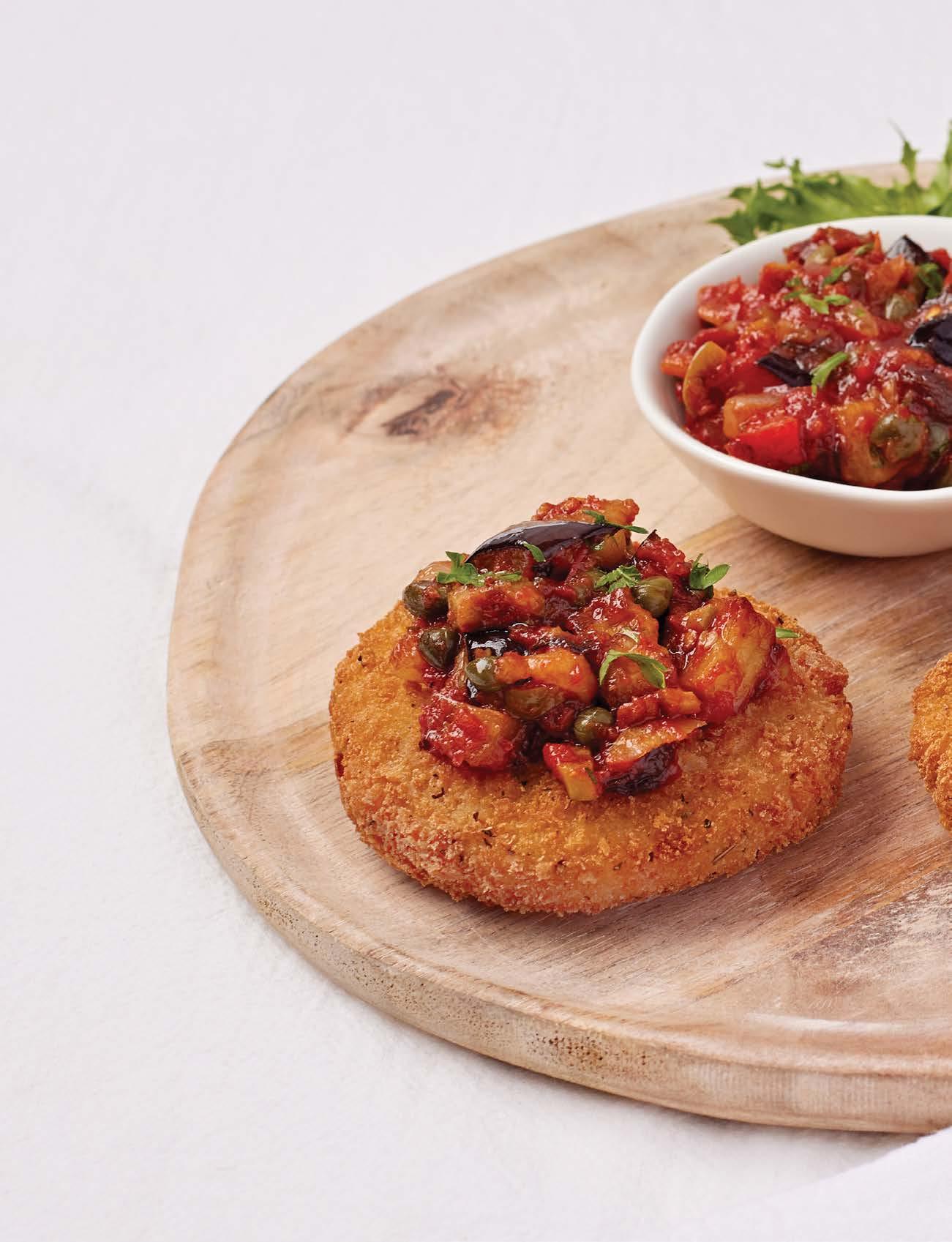 PREP | Prepare the Parmesan Crusted Krabbycakes® according to package instructions and 165°F internal temperature. Season the eggplant with the salt and let sit for 20-30 minutes. Pat dry. Sprinkle the eggplant with olive oil and roast for 25 minutes. In a sauté pan, heat the remainder of the olive oil and sauté the onions and peppers. Add the tomatoes, capers, olives, raisins, honey, bay leaf and pepper flakes. Add the vinegar and wine and simmer for 10-15 minutes. Stir in the roasted eggplant and finish with salt, pepper and fresh parsley. Spoon the Caponata over the Krabbycakes® and enjoy!!
