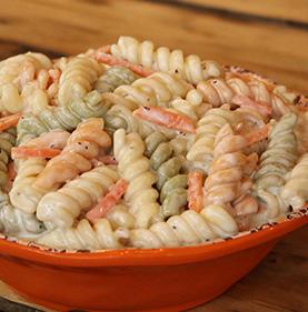 Rainbow rotini in mayo & vinegar dressing with carrots, onions, green peppers, cucumbers and celery.