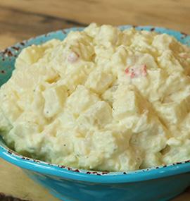 A basic potato salad made with a salad dressing and mustard base. A perfect complement to sandwiches, fried chicken, burgers, and barbecue ribs.