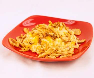 2. In a large bowl, combine thawed hash browns and melted butter. Add 3 lbs of the cheese and 12 oz (about half) of the French Fried onions and mix.