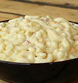 Elbow macaroni in a creamy salad dressing with peas, cheddar cheese, celery, onions and dill relish.