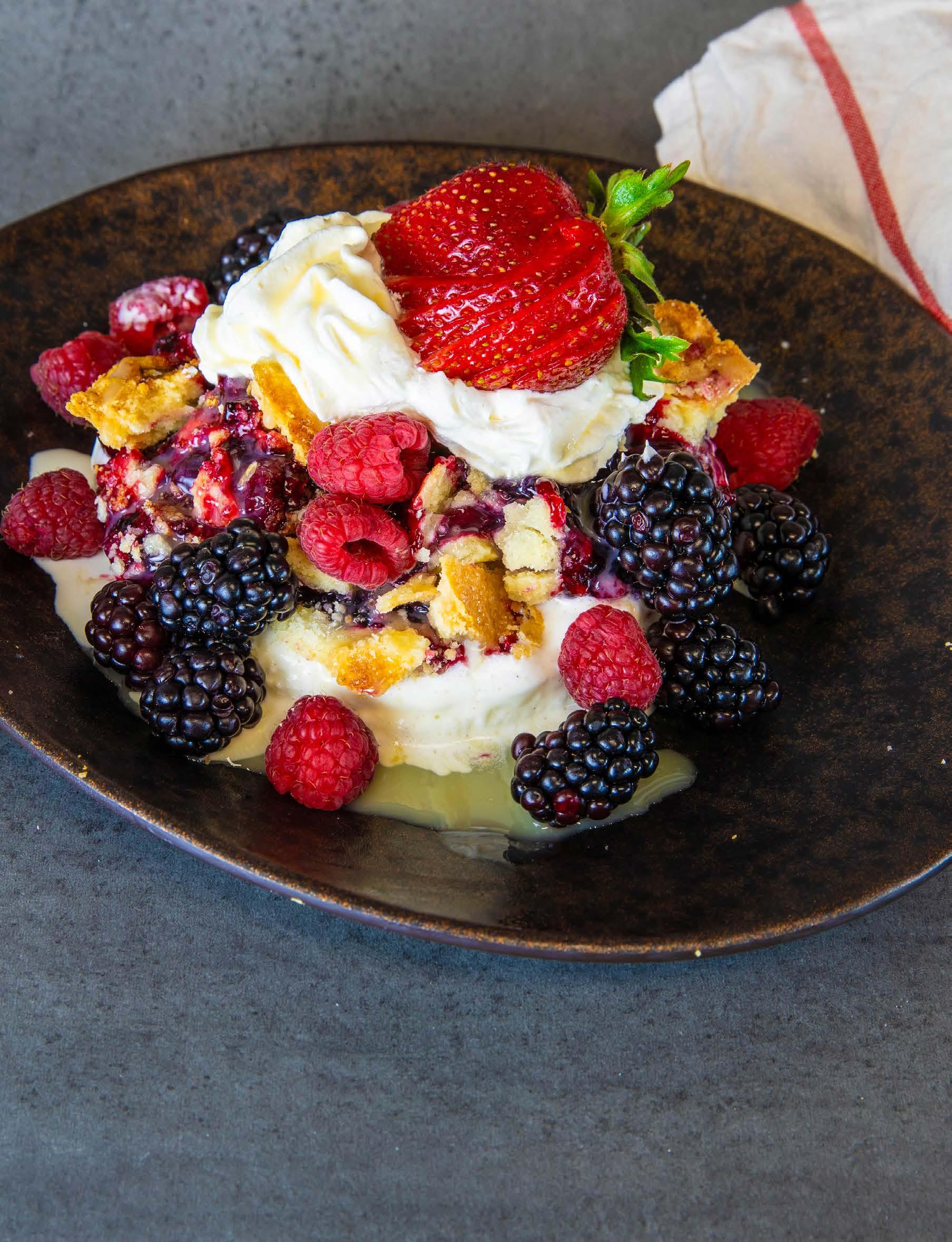 PREP | Scoop ice cream into a serving dish, spread the ice cream to make a small well in the center. Using a #8 disher, scoop the pie place into the ice cream well. Drizzle with the white chocolate, top with on top, and berries.
