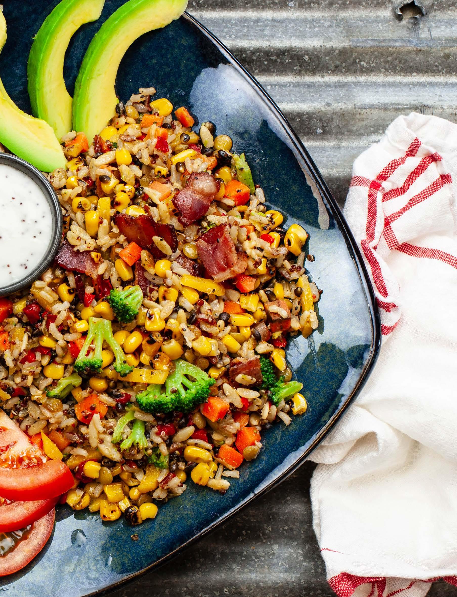 PREP | Quinoa blend - Heat 2 Tbsp. oil in a skillet on MED-HIGH heat. Sauté half bag of frozen product and flame roasted corn for 7 minutes, covered, stirring frequently. After cooked, add bacon.