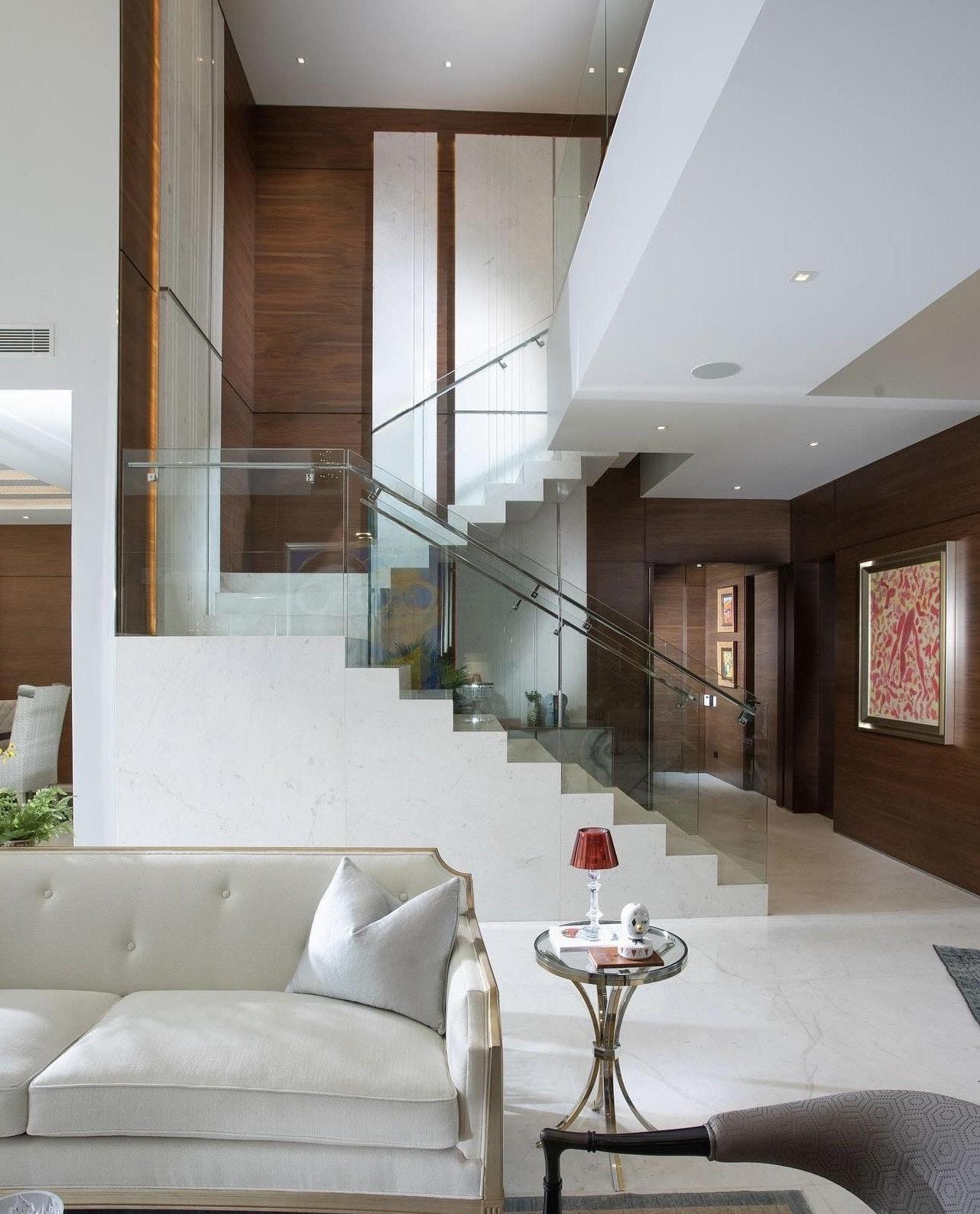 furniture maintains a clean aesthetic, adhering to mid-century modern style principles, while incorporating contemporary details.The staircase, prominently located in front of the room, was designed to be a striking yet cohesive element. We encased the central beam in glossy gray lacquered wood and designed a glass handrail with stainless steel fittings to complement the overall decor.