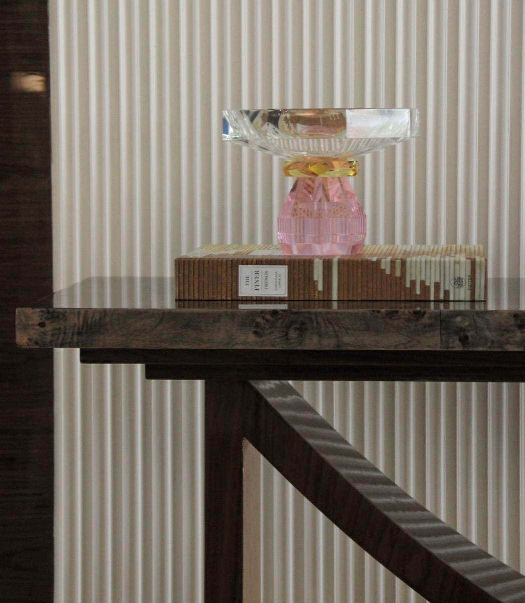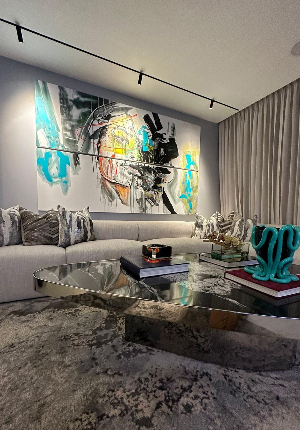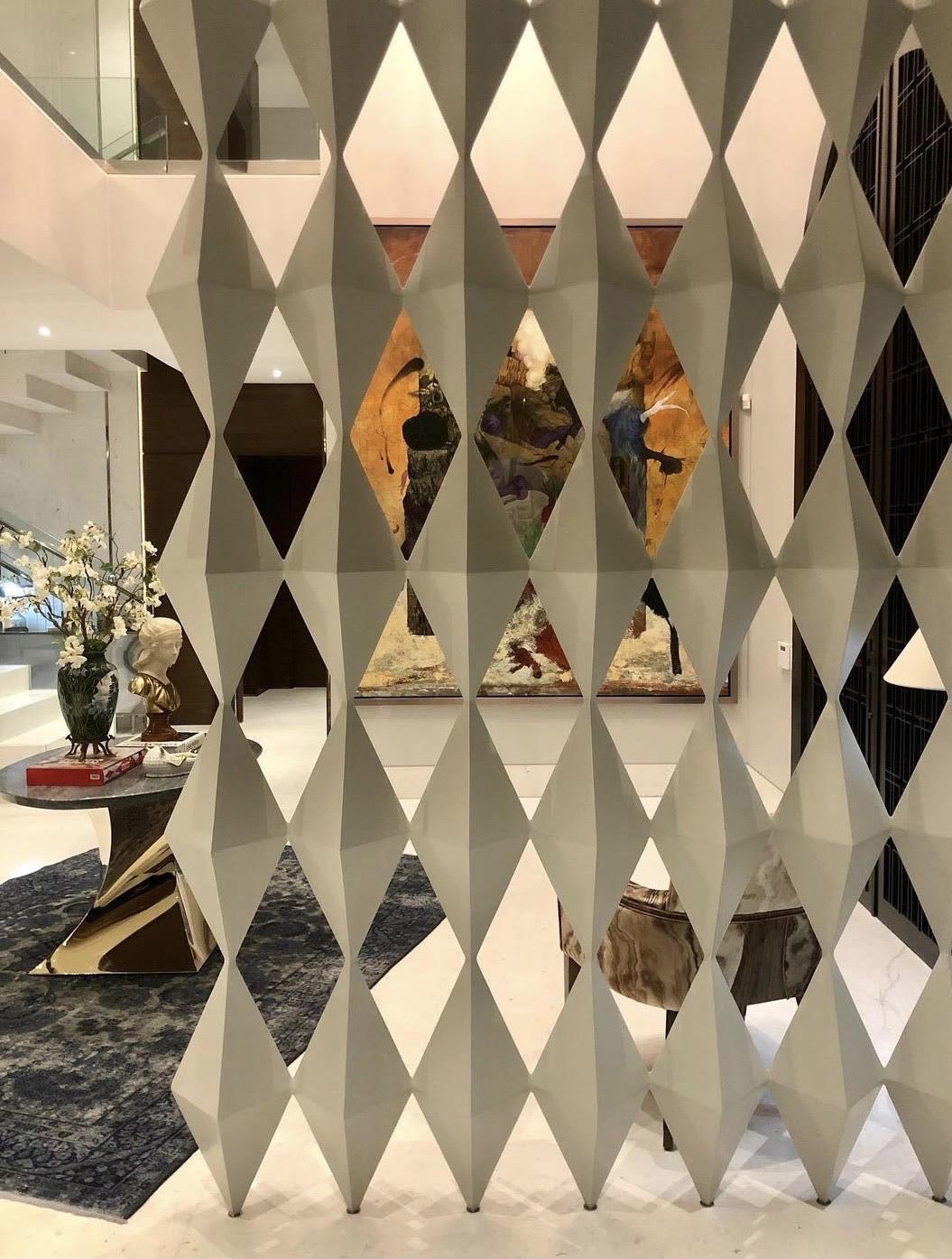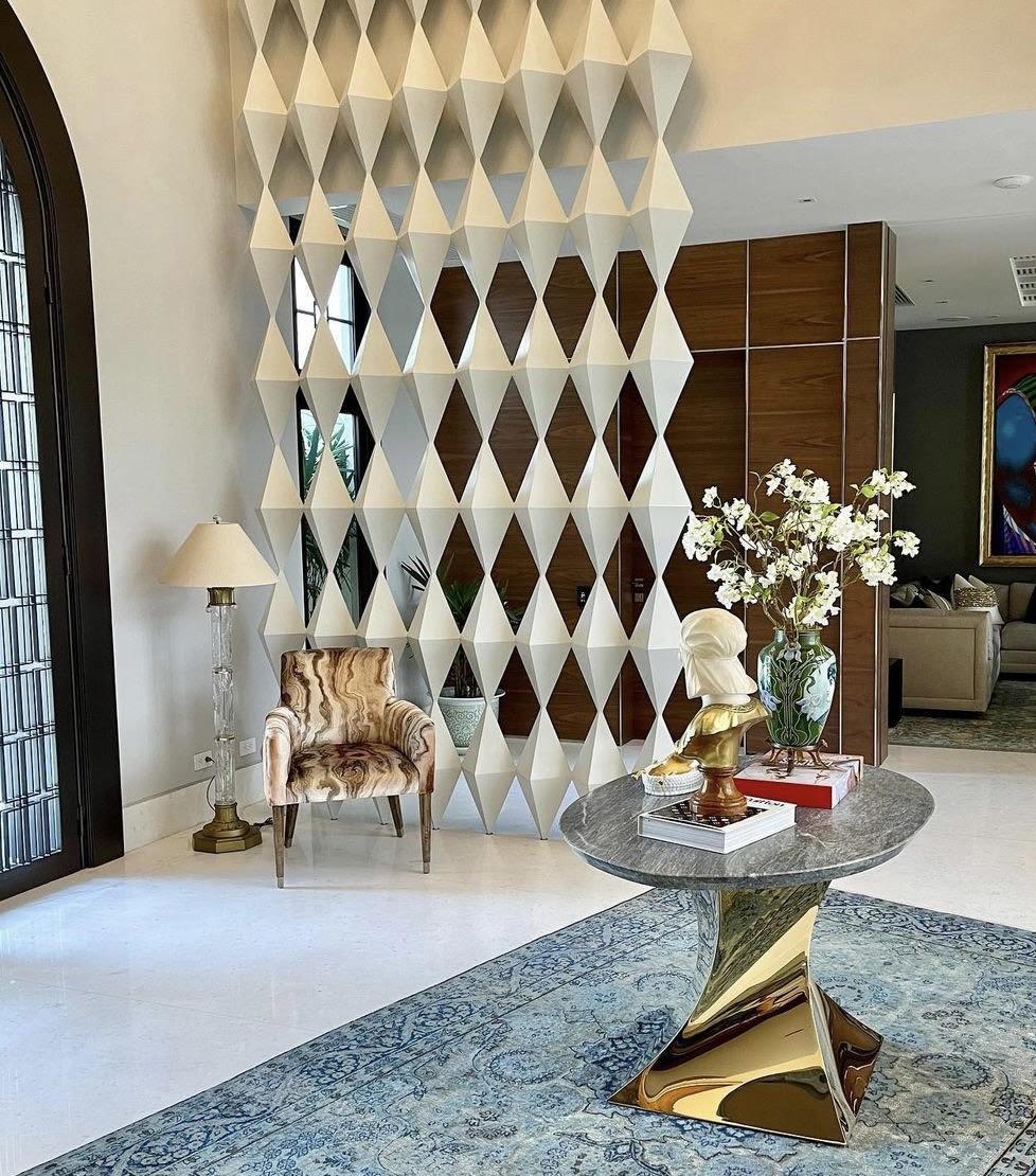 The development of this project was incredibly rewarding. We were responsible for designing everything from the furniture to the overall aesthetic, achieving a fascinating combination of materials and textures that captivate all who visit. The owners requested a blend of traditional and contemporary elements with an artistic flair. As a result, we created unique pieces that resemble sculptures. For instance, in the entrance, we designed a room divider featuring embossed rhombuses in a light gray tone to ensure it remains unobtrusive.