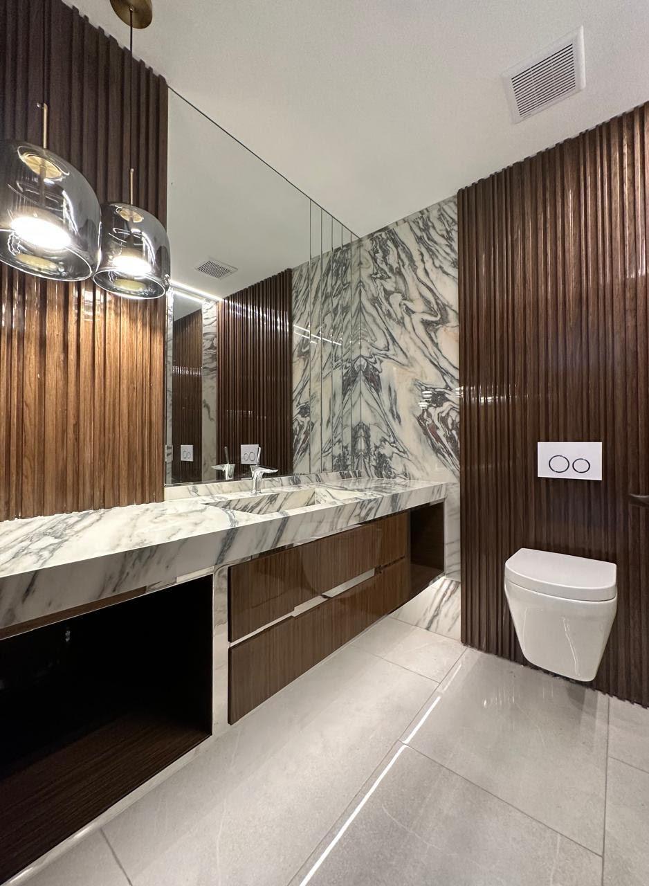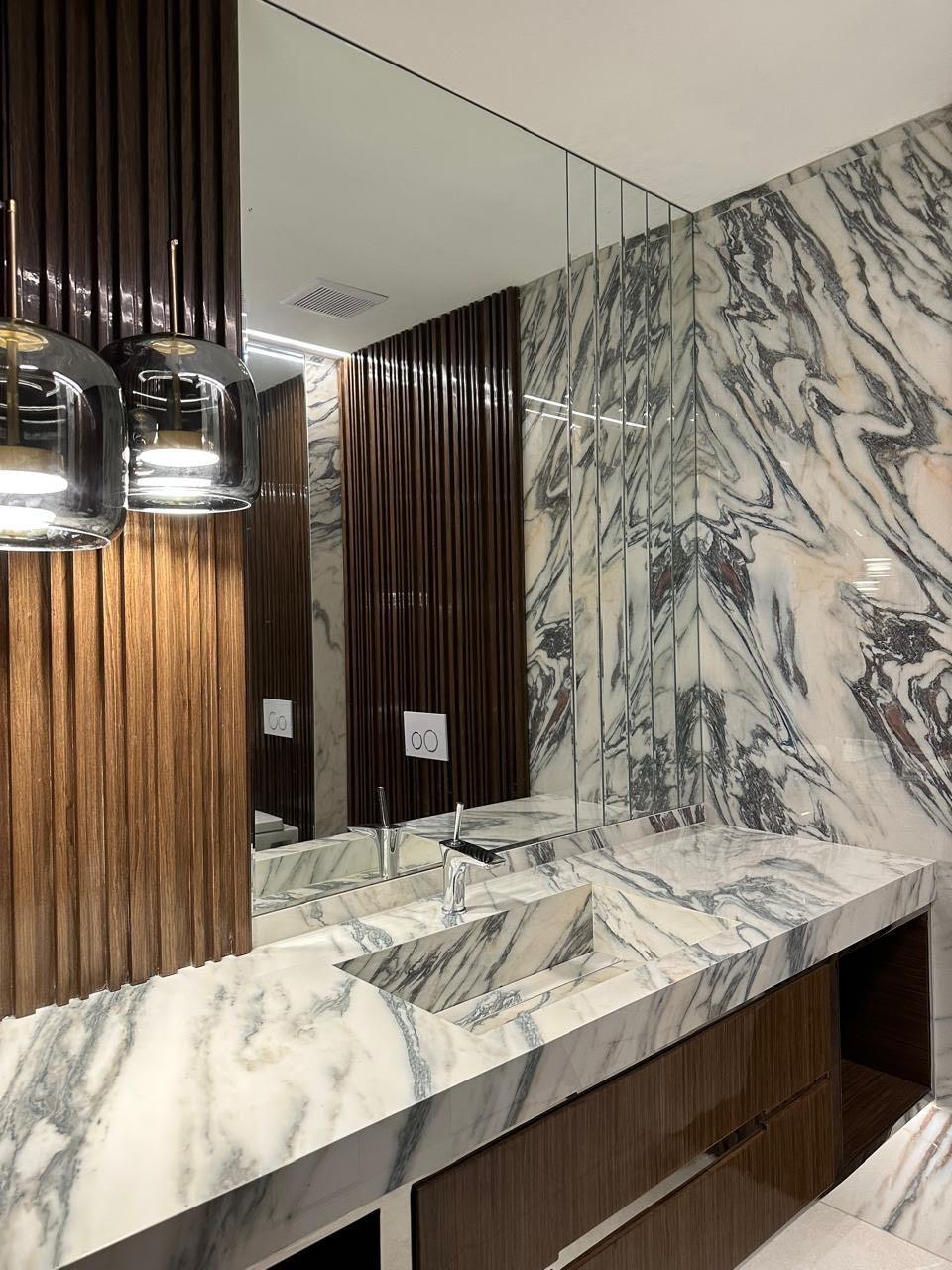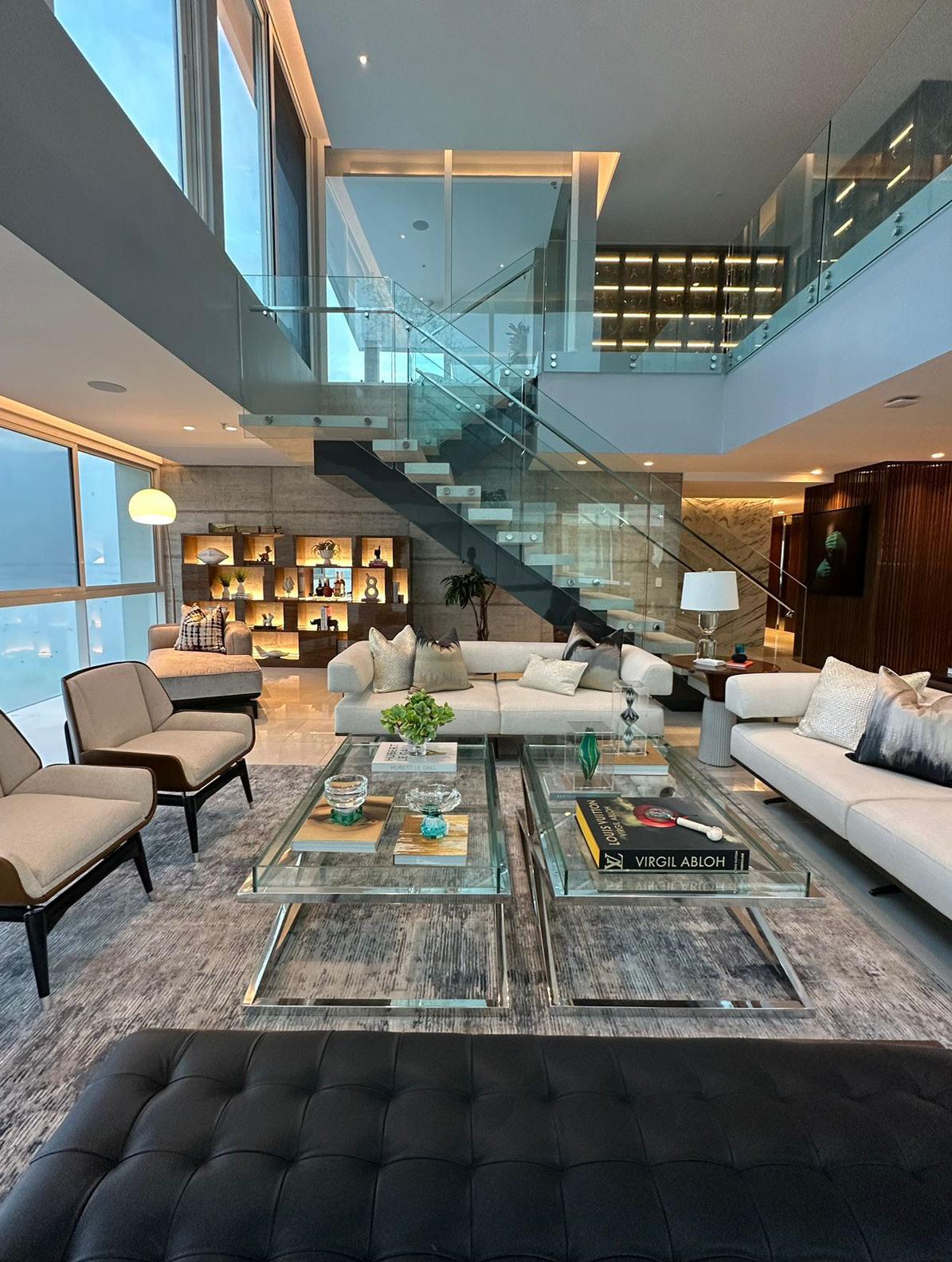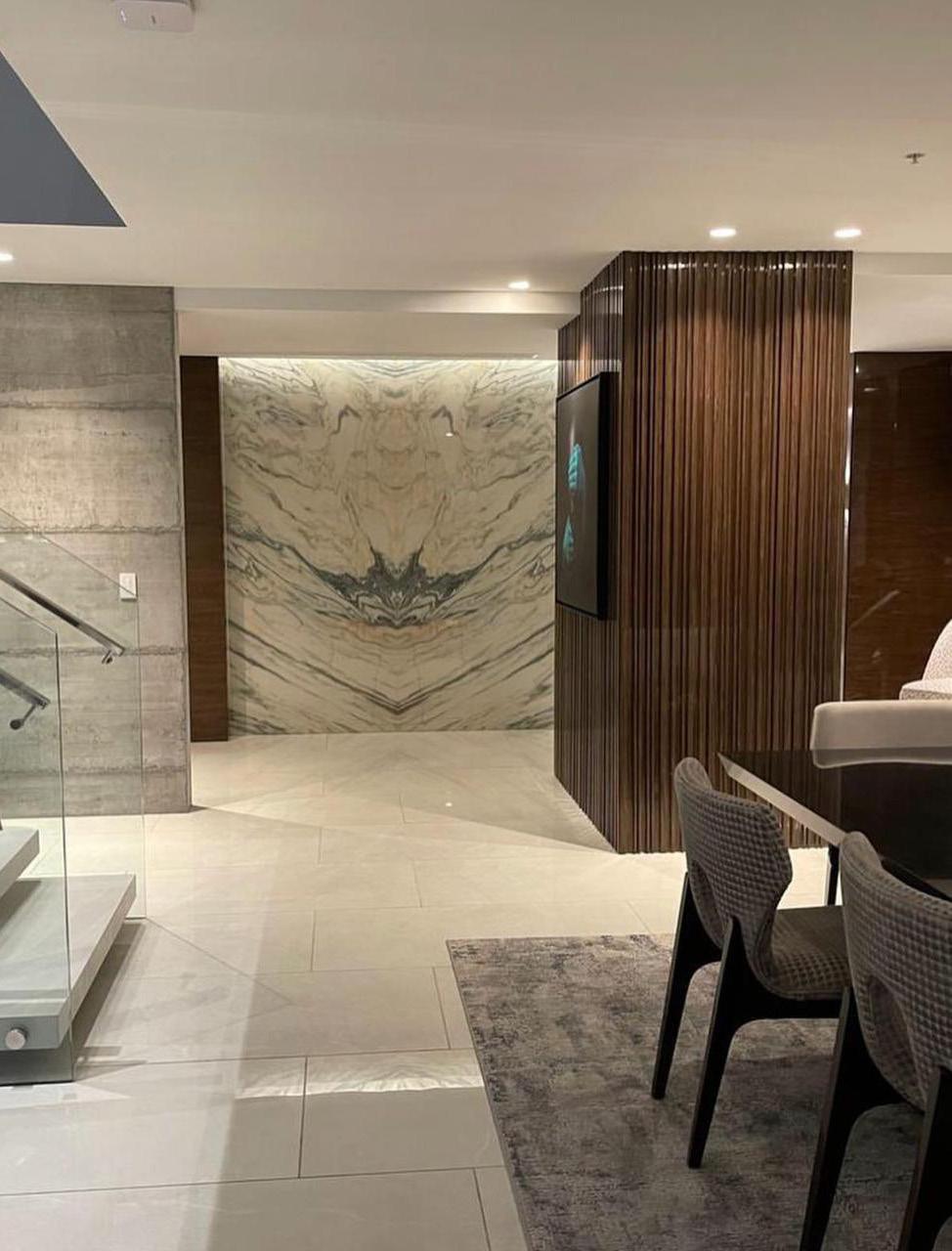 Upon entering this penthouse, you are immediately enveloped by a design that seamlessly blends a variety of materials, creating an elegant and refined atmosphere. We selected a palette of neutral tones to ensure the decor harmonizes with the areas offering spectacular views of the lake. Our hallmark use of natural materials is evident, particularly through our innovative application of wood in various forms.