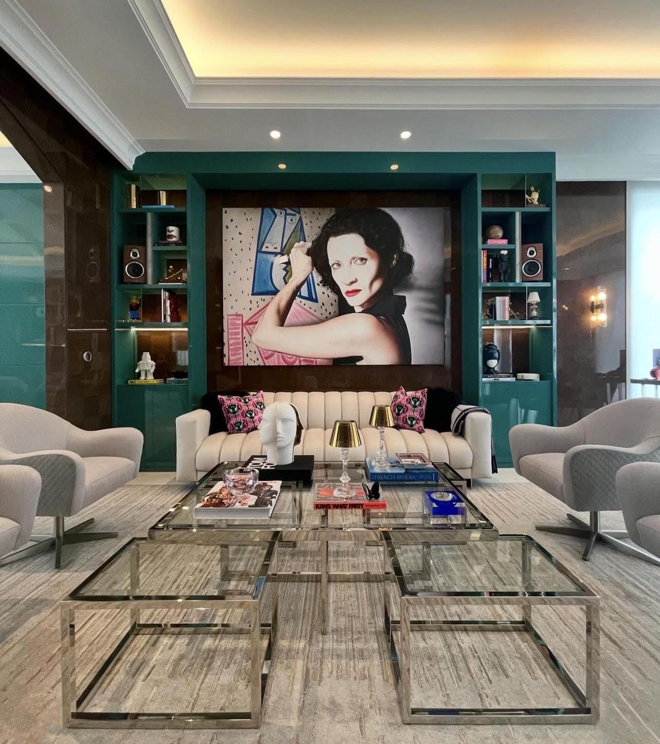 We used oak paneling with steel tubes to create symmetrical sections on the main wall of the room. To maintain a seamless look, we veneered the remaining walls, making the doors less visible. This wood effect helped us create warm and inviting spaces. Metal played a crucial role in our furniture designs, adding an elegant and modern touch. For example, the living room coffee table combines silver and light gold steel tones with a glass top, allowing the base of this piece to be visible at all times.
