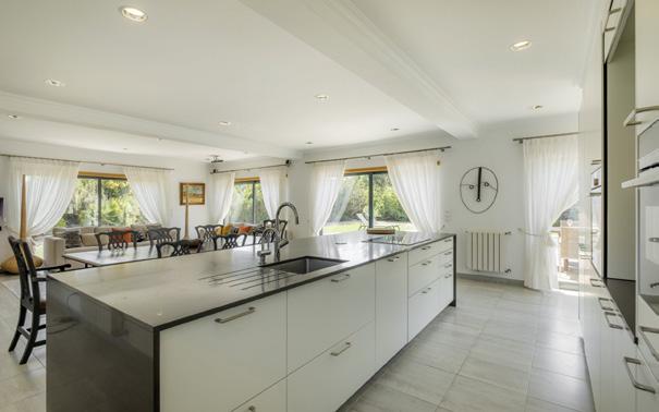 Der offene Ess- und Wohnbereich ist das Herzstück der Villa und geht fließend über in den Garten mit geformten, beheiztem Pool, Essbereich im Freien und großzügiger Terrasse.