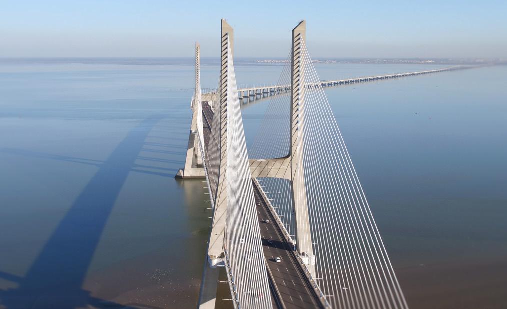 “The view of the Vasco da Gama bridge over the River Tagus at sunrise from Martinhal Residences”