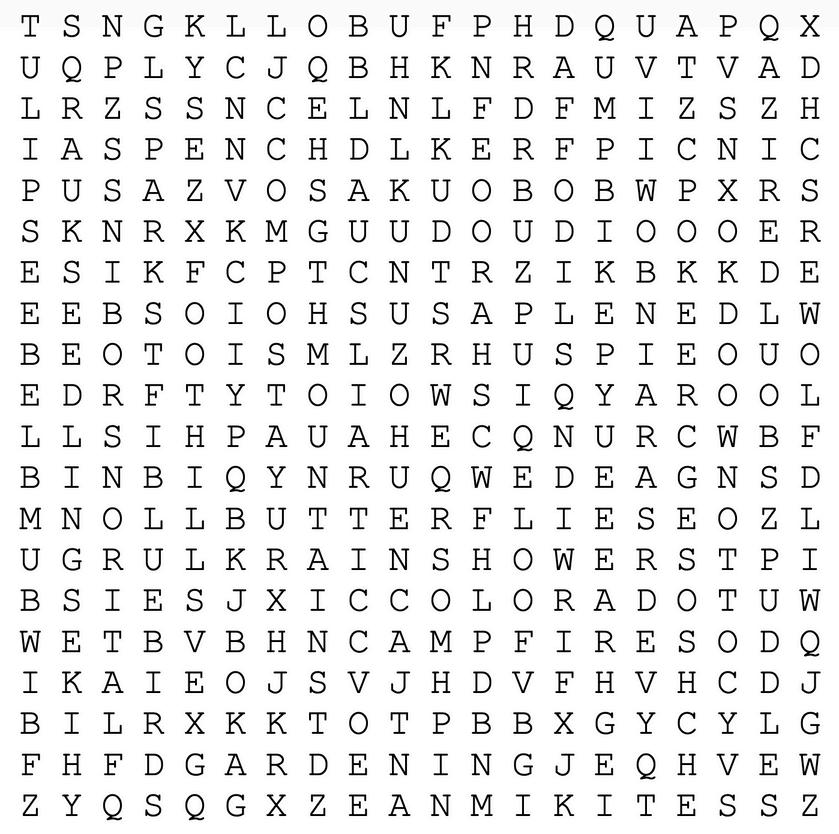 11. BLUEBIRDS 12. ROBINS 13. BUTTERFLIES 14. BUMBLEBEES 15. GARDENING 16. SEEDLINGS 17. COMPOST 18. PICNIC 19. TRAILS 20. HIKE 21. BIKE