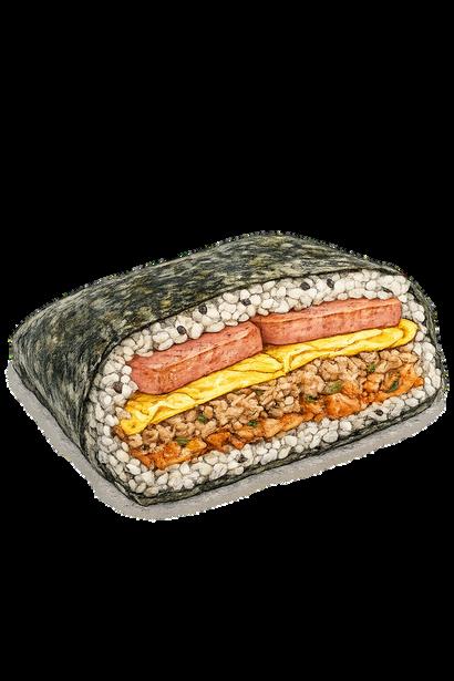 4.Assemble. Lay the seaweed flat. Add fillings to each section and pack a small mound of rice into one section (wet fingers help keep rice from sticking)