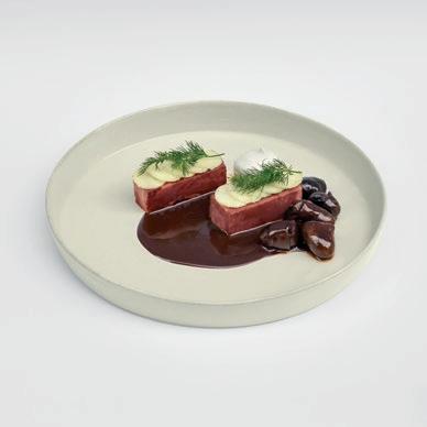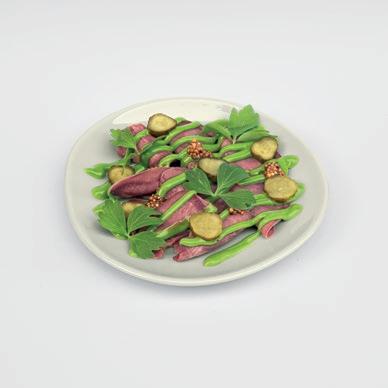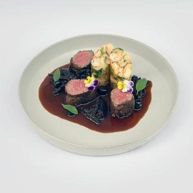 Do mixéru hodím vychlazené maso z běhů, máslo, vejce a nasekaný medvědí česnek. Osolím a opepřím a spěšně rozmixuji na jemnou fáš, aby se směs zbytečně nezahřála a nesnížila se její vaznost. Přidám smetanu a několika pulsy zašlehám. Potravinovou fólii pokladu polovinou plátků slaniny tak, aby se zčásti překrývaly. Na slaninu položím maso hřbetem k sobě a osolím. Na bříško natřu fáš asi do dvou třetin a s pomocí fólie zabalím. Prsty zmáčknu okraje a zatočím na pracovní desce směrem od sebe jako válečkem na těsto, aby se bonbonek dokonale utáhl. Zabalím do další vrstvy fólie. Stejně upravím i druhý hřbet a oba nechám 90 minut chladit.
