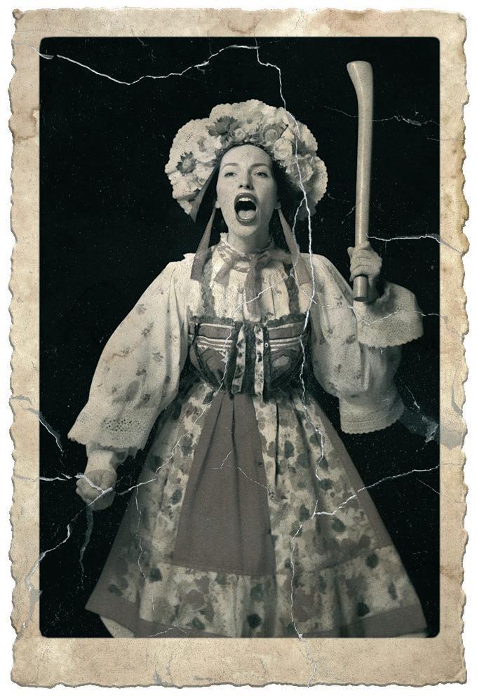 „Ná, ty nehaňbo, co nelezeš dóm pokłúzat?! Krávy řvú, telacka blačíja, svině kvičíja a ty si tu sedíš jak hrábje. Pokap honem!