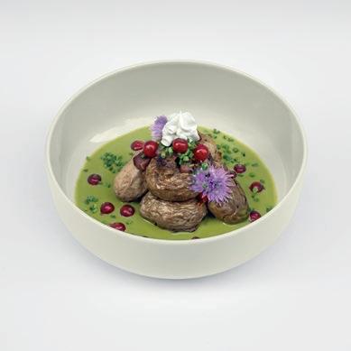 Na hráškový krém si pomalu svařím smetanu na třetinu objemu. Pokud redukci přeženu a tuk se začne oddělovat od tekutiny, zastříknu trochou vody nebo vývaru a rozšlehám metličkou. Oloupu šalotky a nakrájím nahrubo, jarní cibulky nápodobně. V čistém kastrolu rozpustím lžíci másla a nechám na ní změknout obě cibule. Zvýším plamen na plný knedlík, přihodím hrášek a lžíci cukru a restuji asi 3 minuty. Přidám sůl a pepř, podlévám vínem a nechám tekutinu úplně odpařit. Vlévám vývar a přivedu k varu. Celý objem kastrolu přendám do výkonného mixéru, přidám staženou smetanu a na maximální otáčky vymixuji úplně dohladka. Pokud není mixér dost silný, propasíruji ještě krém přes velejemné síto. Vrátím do vymytého kastrolu a dochutím solí, případně pár kapkami citronu.
