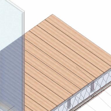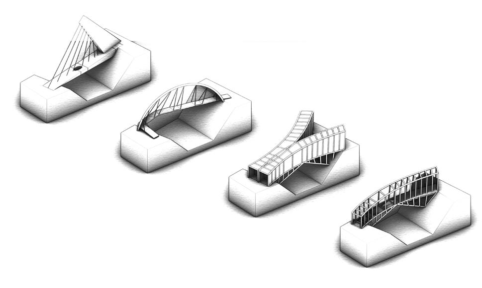 THE BRIDGE SPANS 60 FEET WITH AN UPPER STEEL-CHORD STRUCTURE AND STEEL BEAMS FOR SECONDARY SUPPORT. DESIGNED WITHOUT COLUMNS TO ALLOW PASSAGE, ITS CRESCENT SHAPE IS BOTH A FUNCTIONAL AND AESTHETIC RESPONSE TO ITS SURROUNDINGS. THE GRADUAL SLOPE OF THE BRIDGE SEAMLESSLY BLENDS INTO THE LANDING, CREATING A SMOOTH TRANSITION.