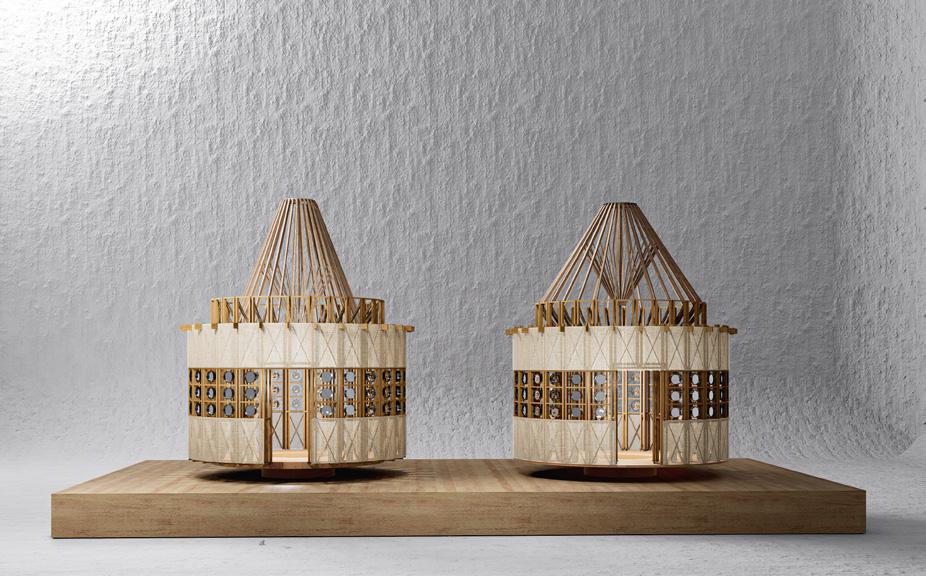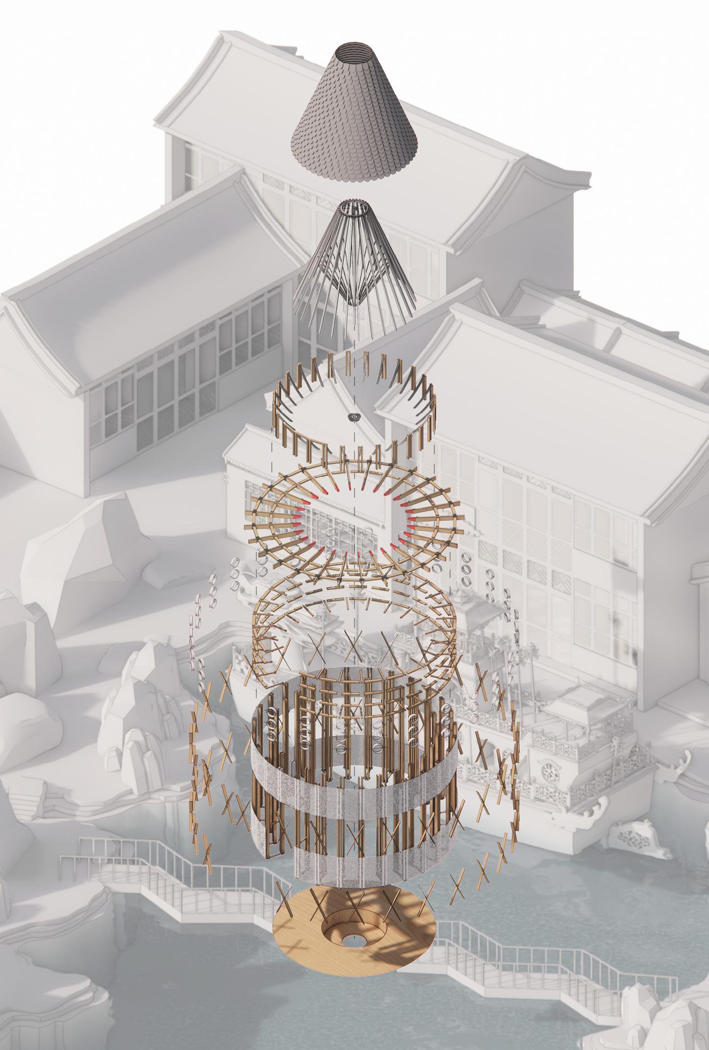 As one of the important intangible cultural heritages of Suzhou's traditional handicrafts, oil-paper umbrellas have a high degree of aesthetic accumulation and cultural literacy. At the same time, the polygonal space enclosed by the exquisitely handmade umbrella frame, umbrella handle and umbrella support has the original characteristics of architecture as a shelter (mostly seen in circles and octagons). This project uses "oil-paper umbrellas" as a carrier to re-deconstruct and re-combine the aesthetic and cultural structure of traditional intangible cultural heritage, transforming it into the top of a contemporary pavilion, maximizing the original long-standing cultural attributes and allowing viewers to feel the exquisiteness and agility of traditional Chinese craftsmanship.