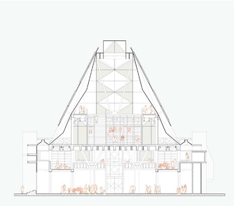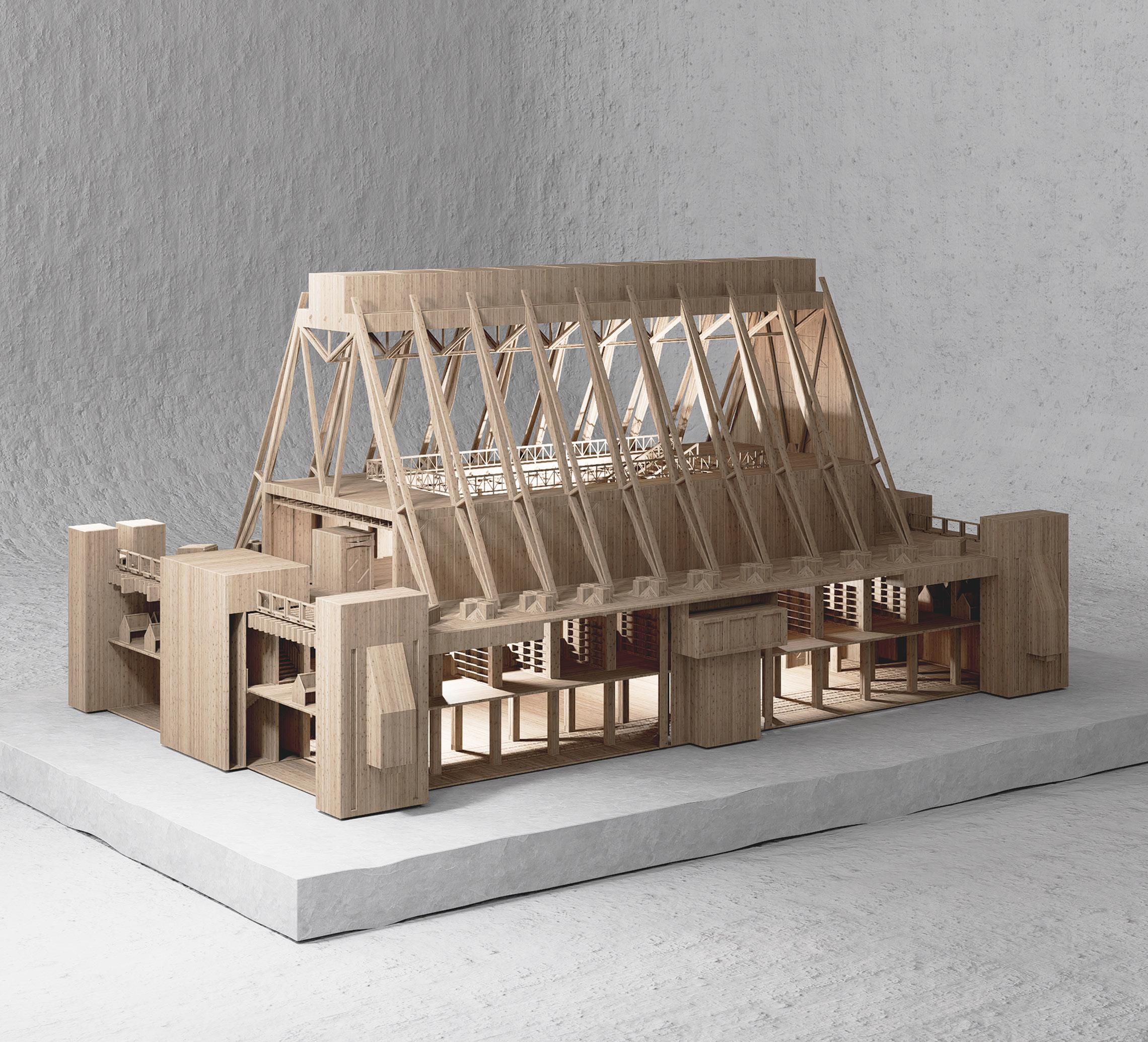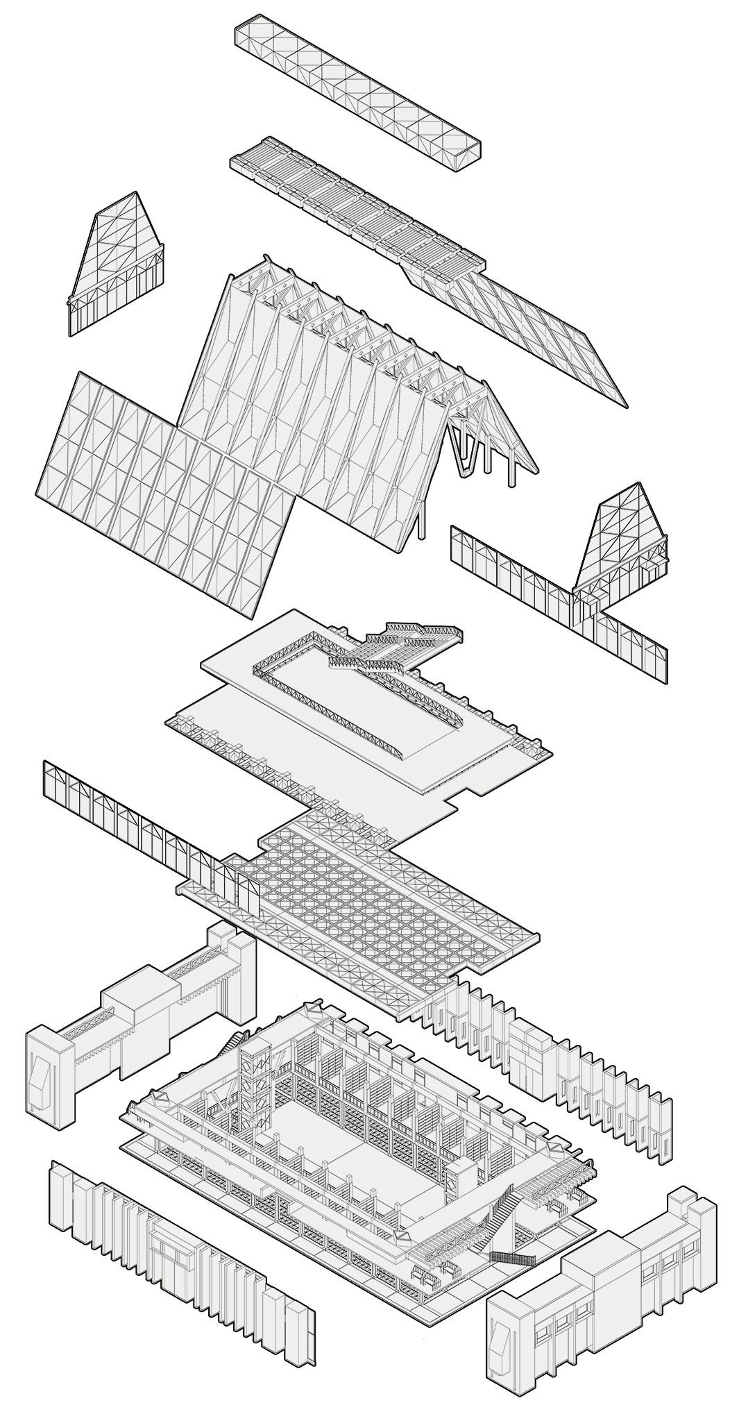 The harmonious proportion relationship between the roof and the body of the building was determined by the above group, and then the way of fine-tuning the proportion of the sliding layer of the roof of the building and the way of framing and leaking the view at the junction of the upper layer of the lower body was deliberated and evolved, forming the relationship between the building and the viewer's upward perspective.