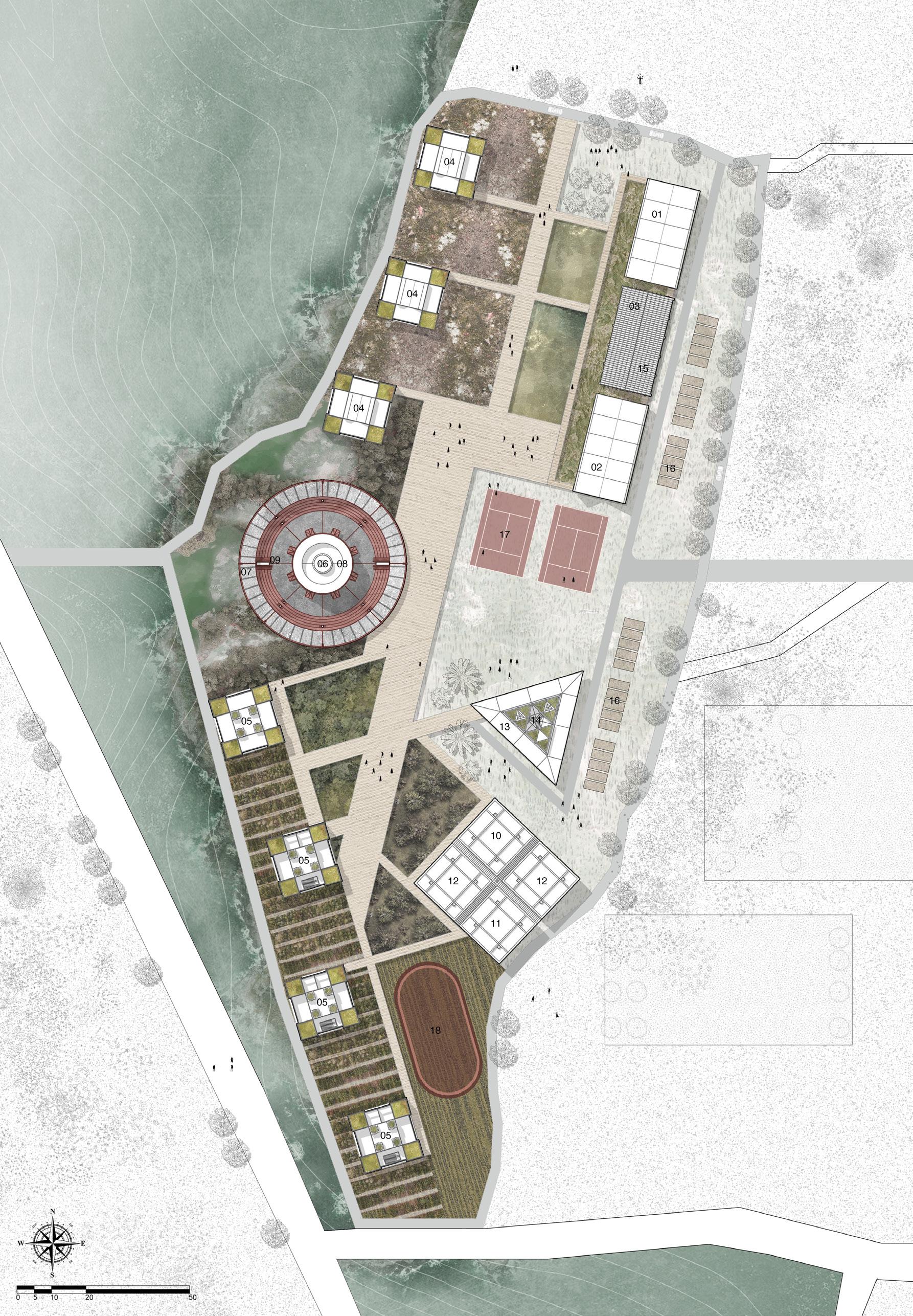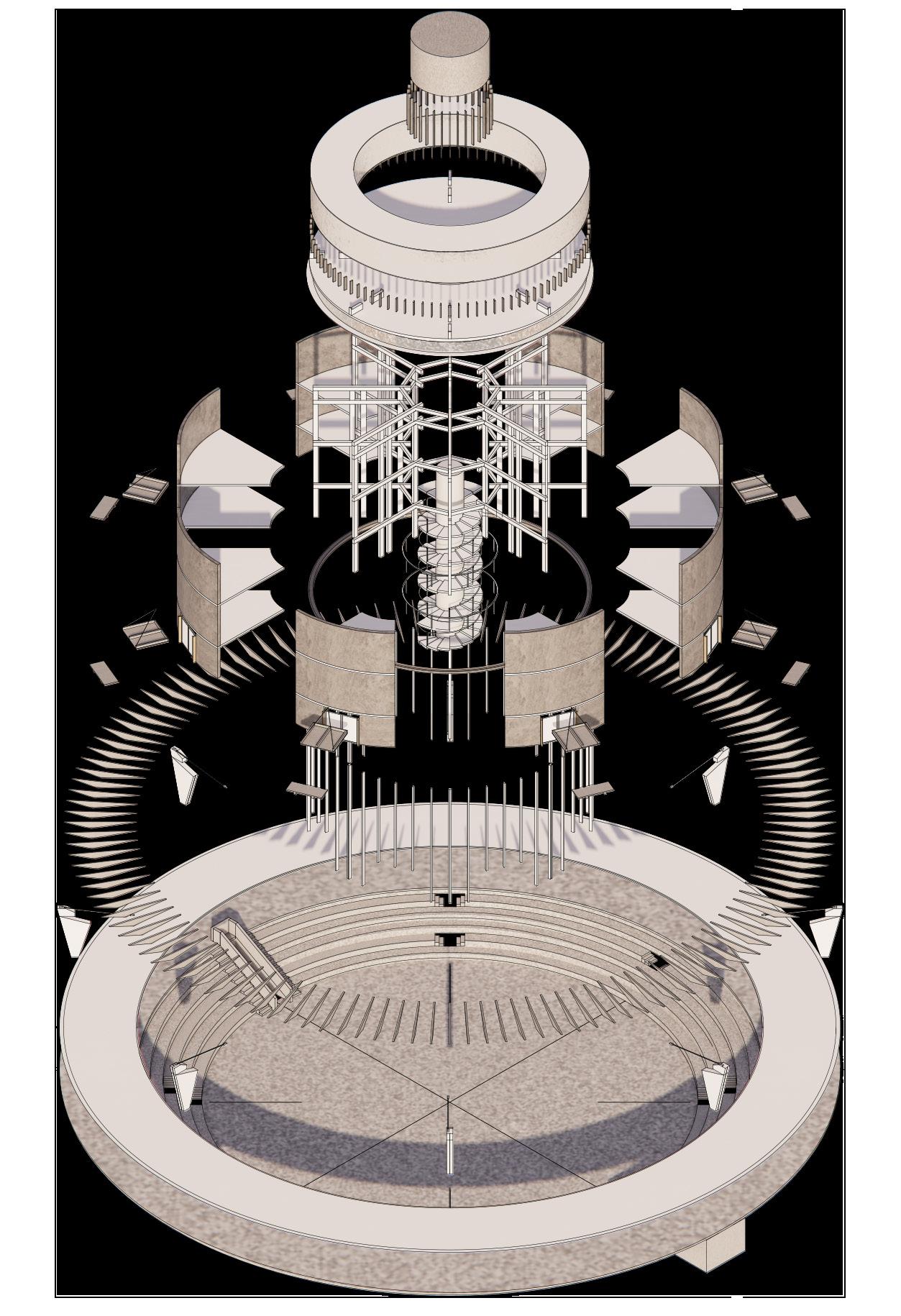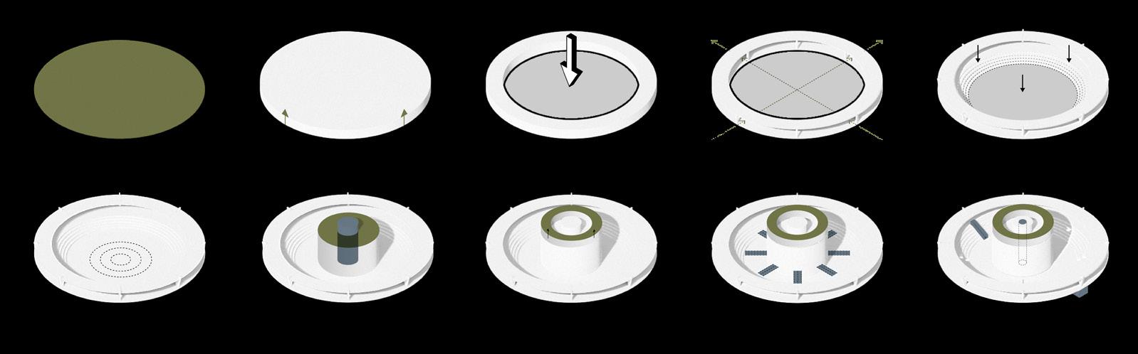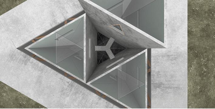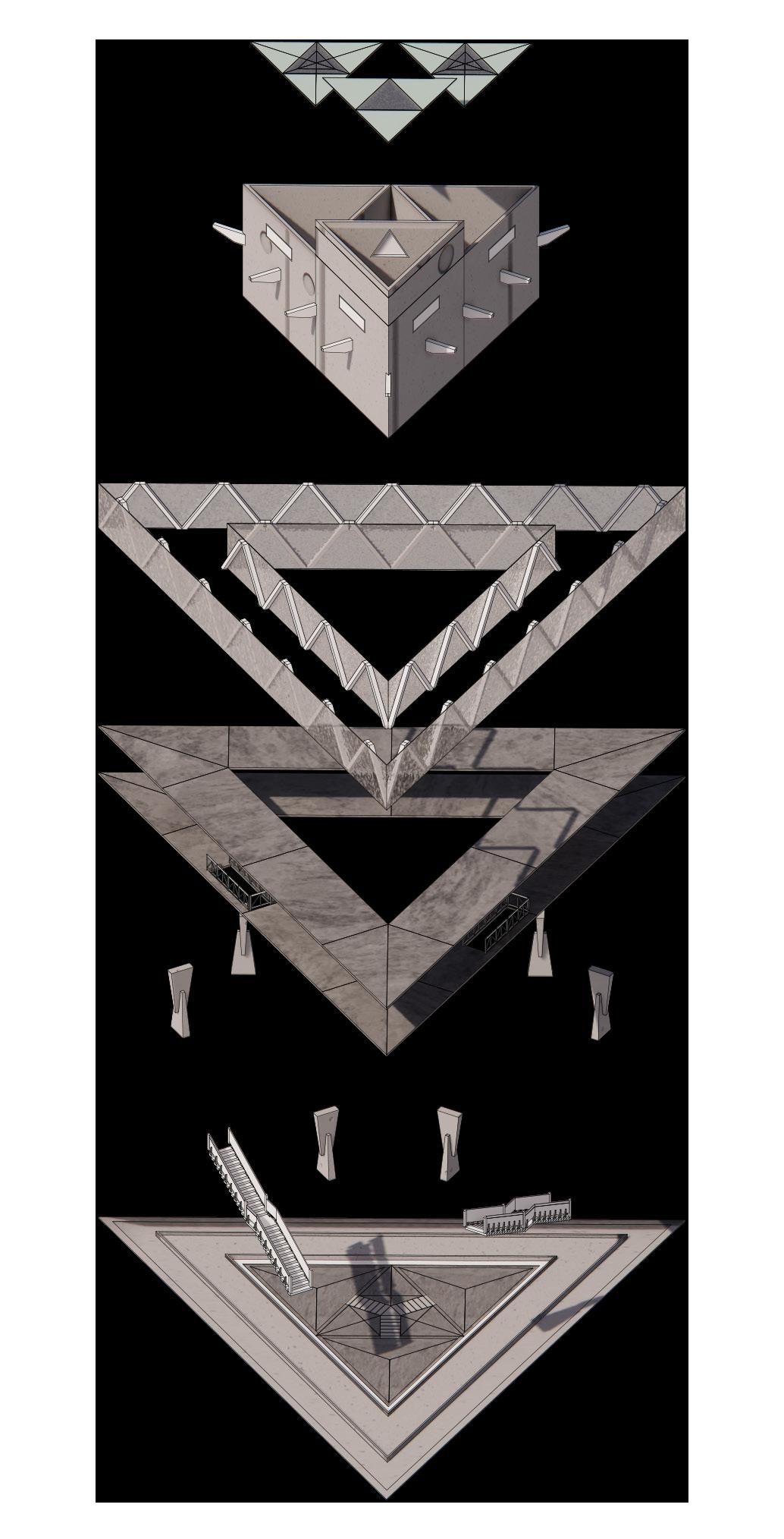 How to change our architectural principles to adapt to the mysterious side of this historical site that has experienced thousands of years, so in this project, I challenged myself to put the extracted primitive geometric shapes (square, circle and triangle) into the logic of assembly and construction. By embracing this myth, the building complex is reimagined not as an ancient spiritual place, but as a modern retreat filled with wonder and whimsy, becoming a symbol that permeates the past and present.